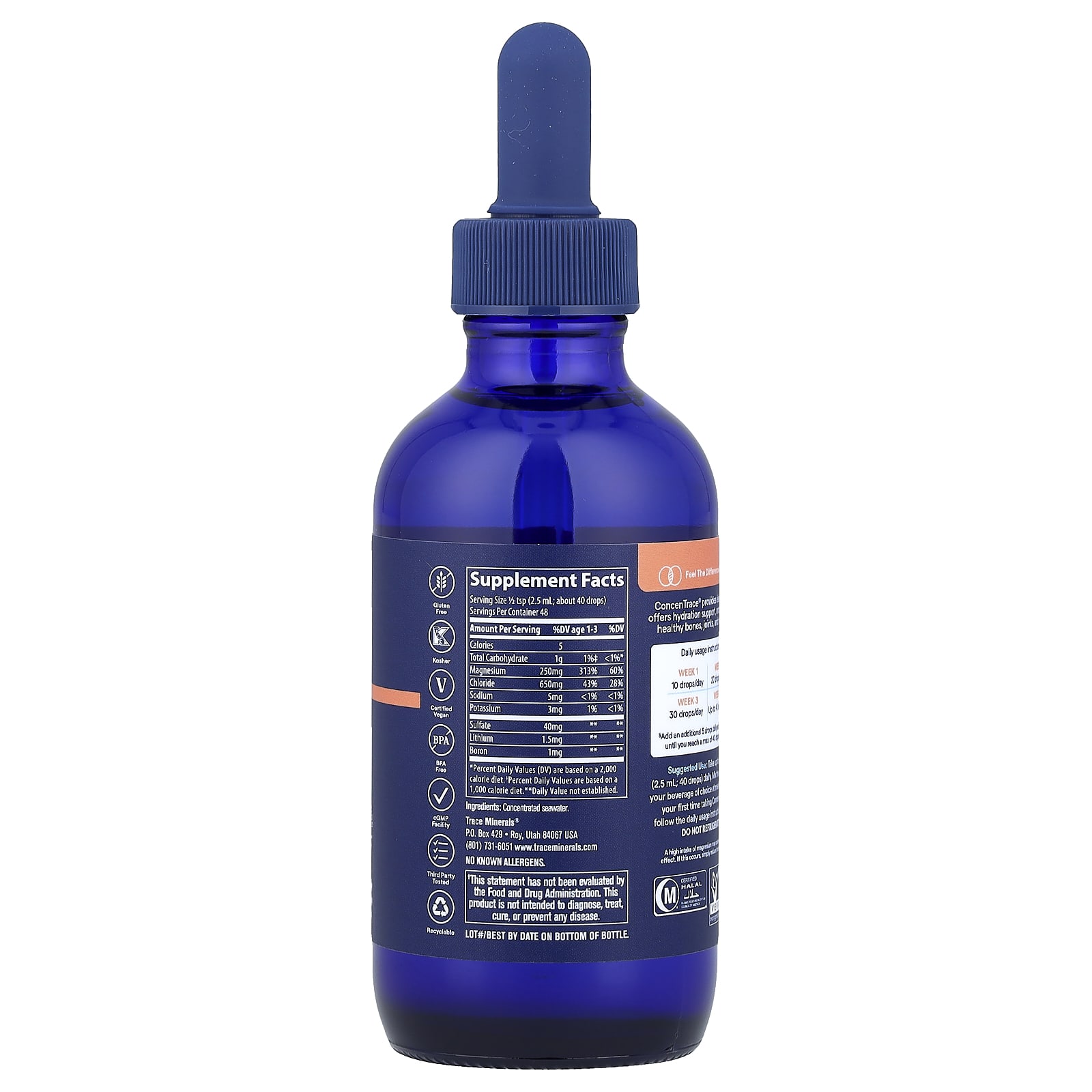 Принимать до 1/2 чайной ложки (2,5 мл; 40 капель) в день. Смешайте капли с любимым напитком во время еды. Если вы принимаете ConcenTrace® впервые, следуйте приведенным выше инструкциям по ежедневному использованию.