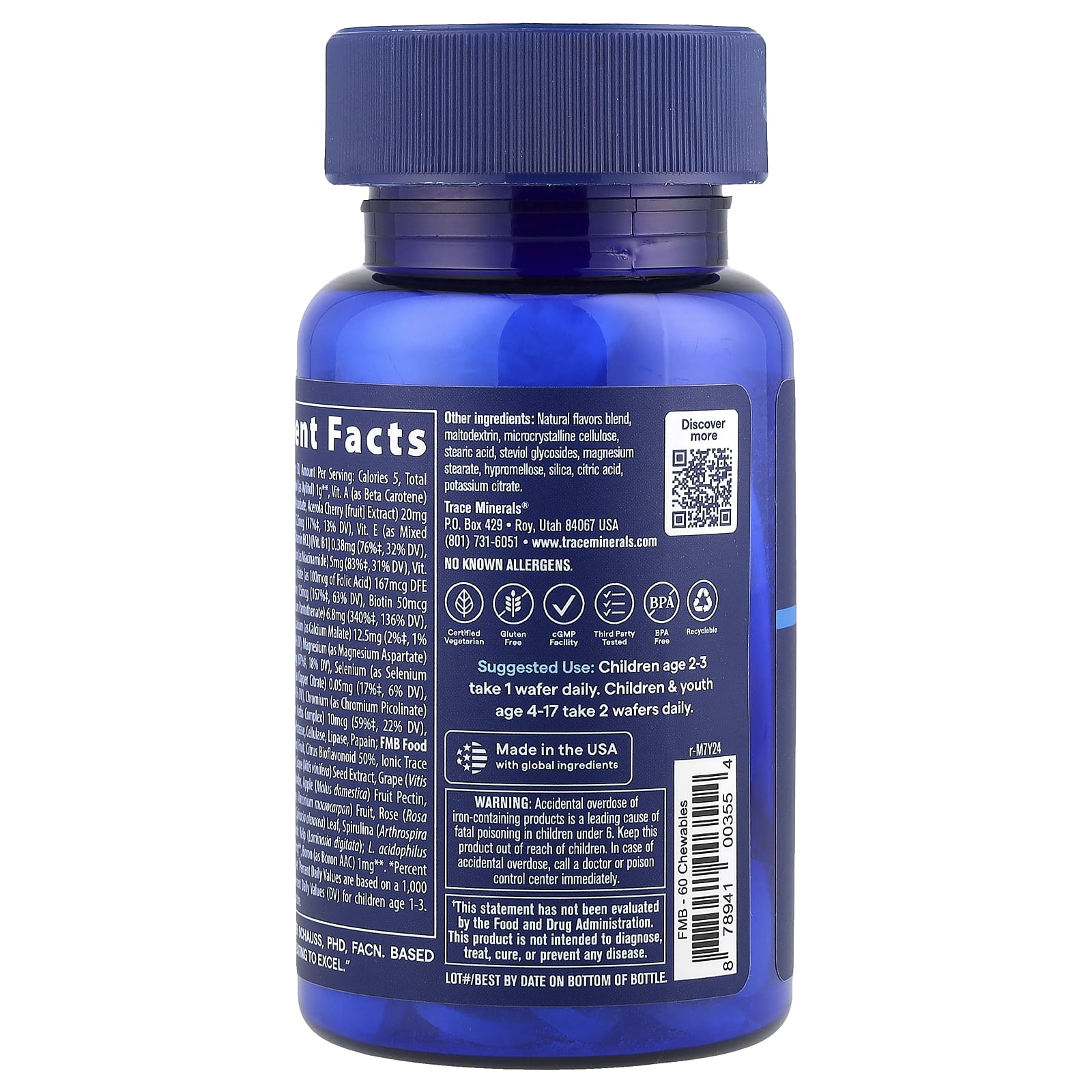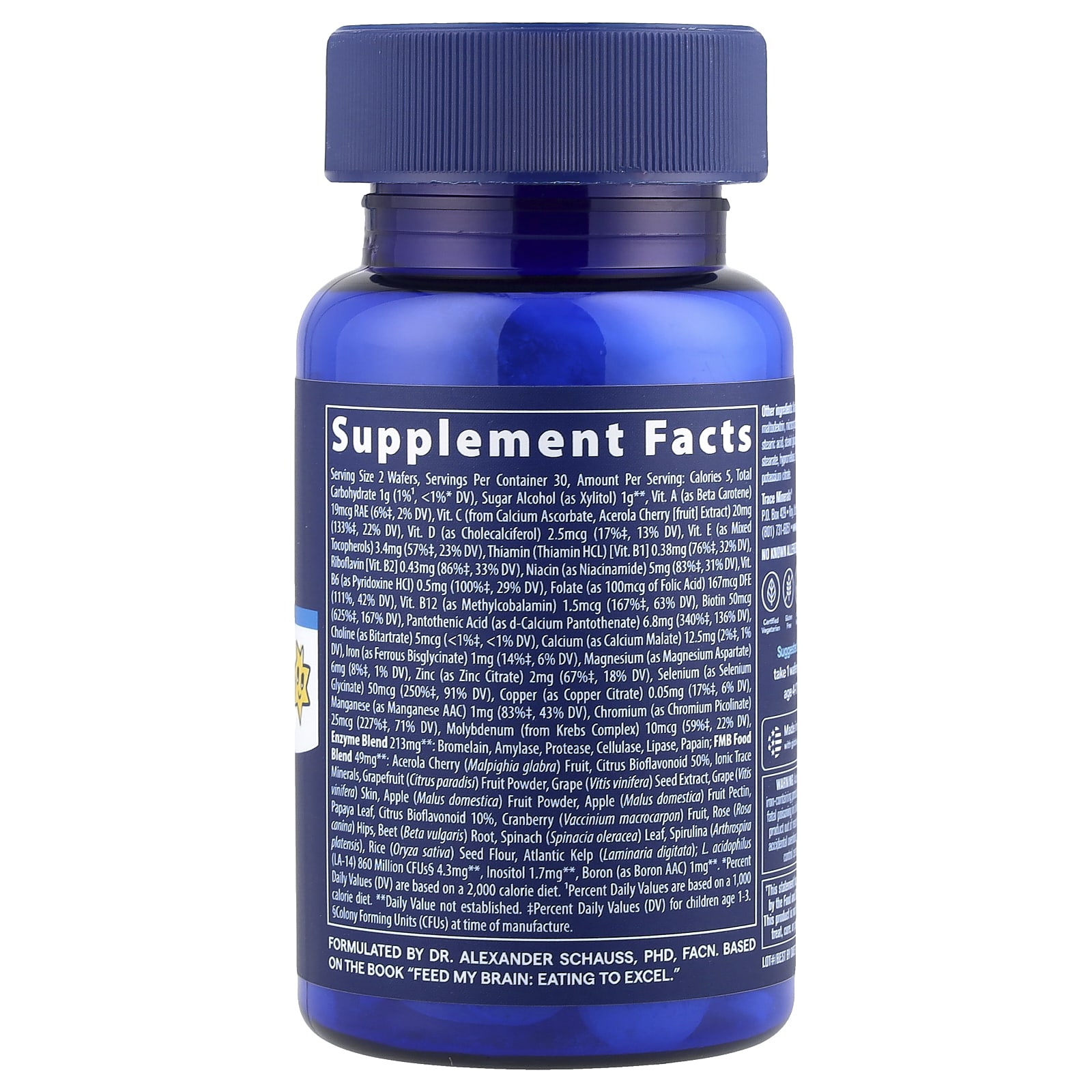 | Пищевая смесь FMB Ацерола (Malpighia glabra), цитрусовые биофлавоноиды, 50% ионные микроэлементы, фруктовый порошок грейпфрута (Citrus paradisi), экстракт виноградных косточек (Vitis vinifera), кожица винограда (Vitis vinifera) Яблоко (Malus domestica), фруктовый порошок domestica), пектин плодов, листья папайи, биофлавоноид цитрусовых 10%, клюква (Vaccinium macrocarpon), плоды розы (Rosa canina), корень свеклы (Beta vulgaris), шпинат (Spinacia oleracea), спирулина (Arthrospira platensis), рис (Oryza) sativa), мука из семян атлантических водорослей (Laminaria digitata); L. acidophilus (LA-14) 860 млн КОЕ§ 4,3 мг **, инозитол 1,7 мг **, бор (в виде бора AAC) 1 мг **. | 49 мг | ** |