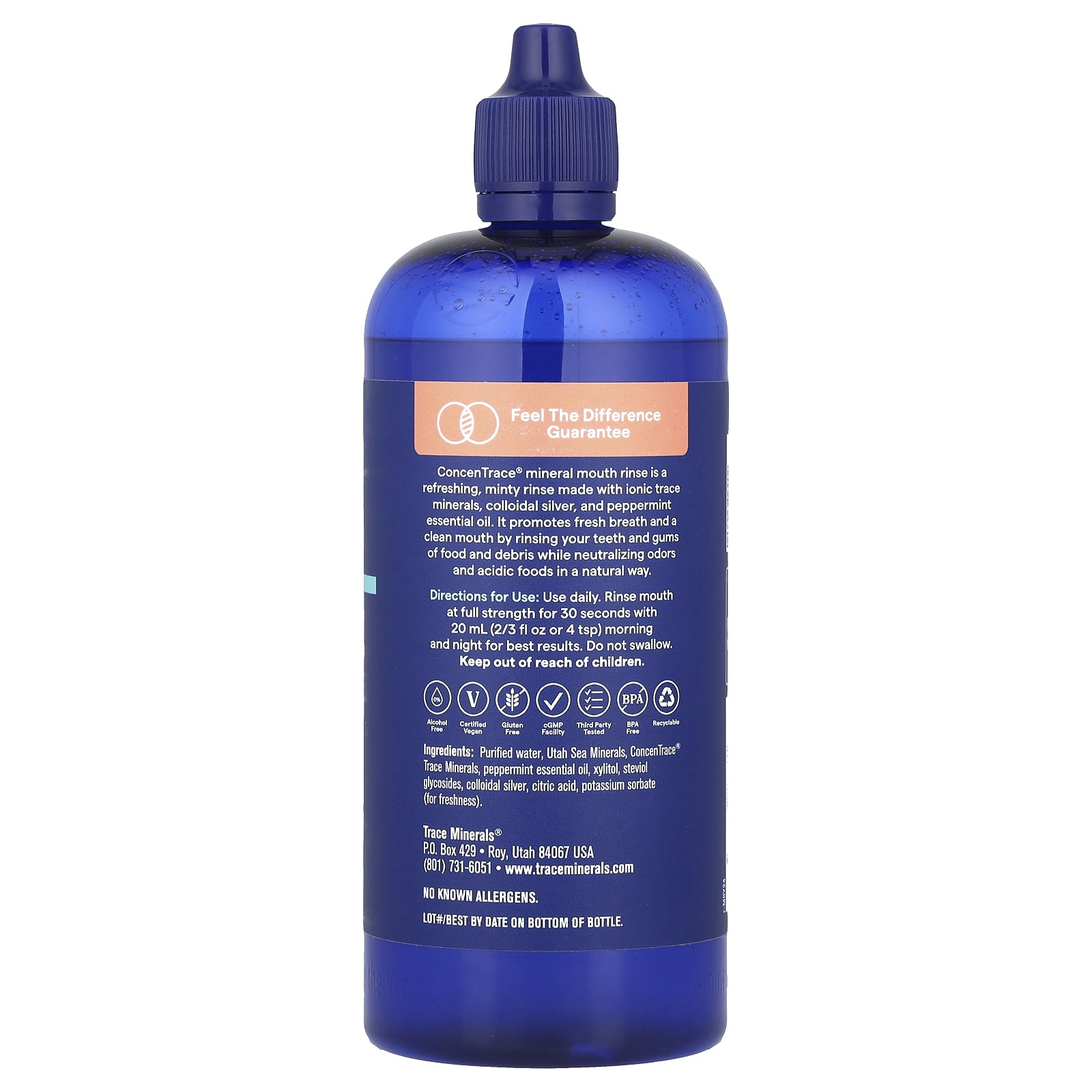 Очищенная вода, Минералы моря Юты, Микроэлементы ConcenTrace®, эфирное масло перечной мяты, ксилитол, стевиолгликозиды, коллоидное серебро, лимонная кислота, сорбат калия (для свежести).