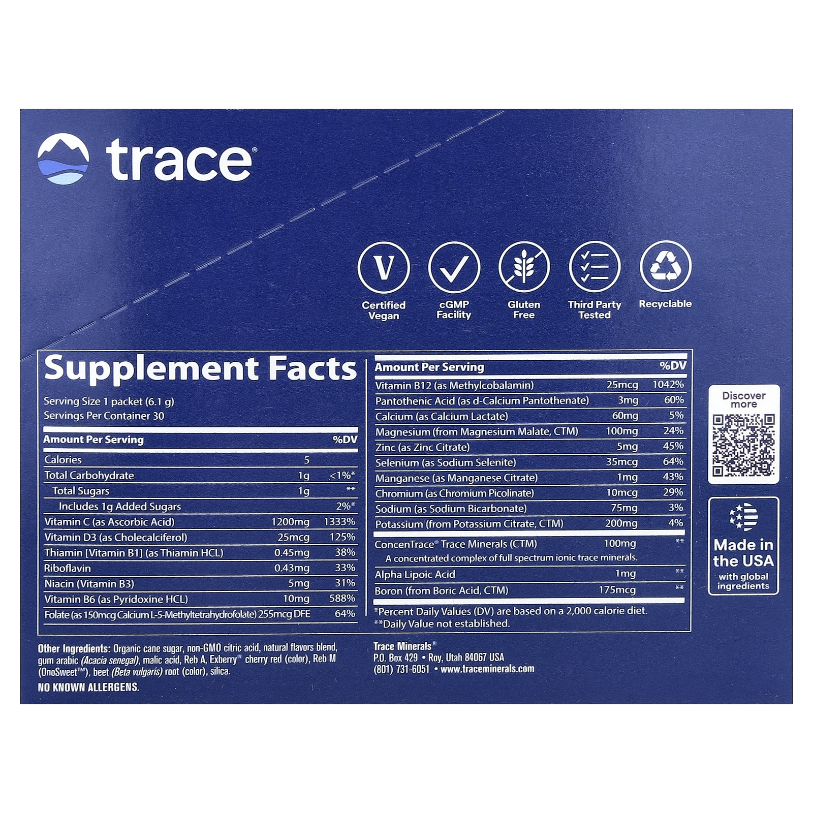 Добавка Power Paks от Trace Minerals содержит лидерскую дозу в 1200 мг витамина C, а также витамины группы B, необходимые электролиты, такие как натрий, калий, магний и кальций, и не содержит искусственных ароматизаторов, красителей или подсластителей. Мы также добавили ConcenTrace®, комплекс ионных микроэлементов полного спектра, для поддержания минерального баланса в организме.