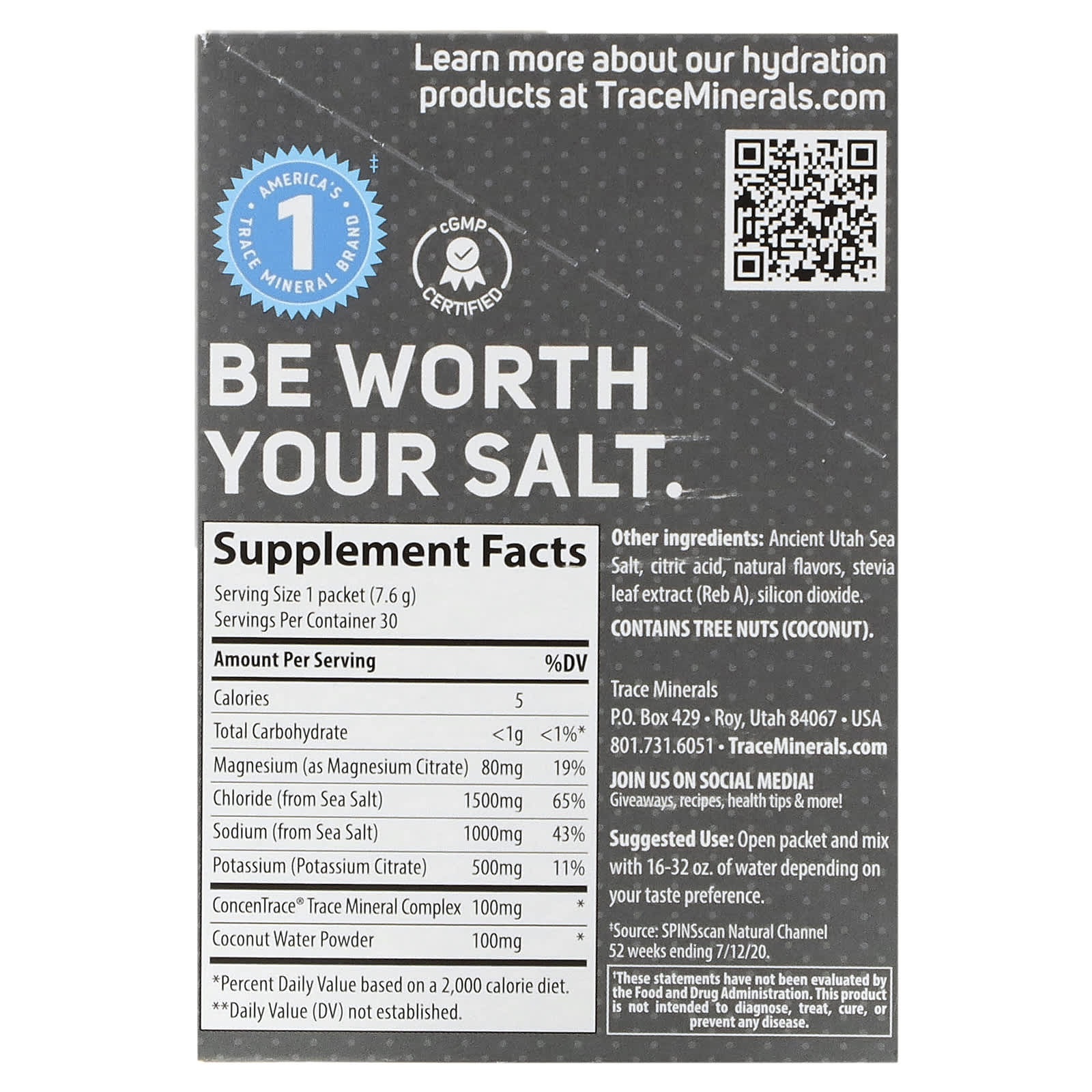 Древняя морская соль из Юты, лимонная кислота, натуральные ароматизаторы, экстракт листьев стевии (реб. A), диоксид кремния.