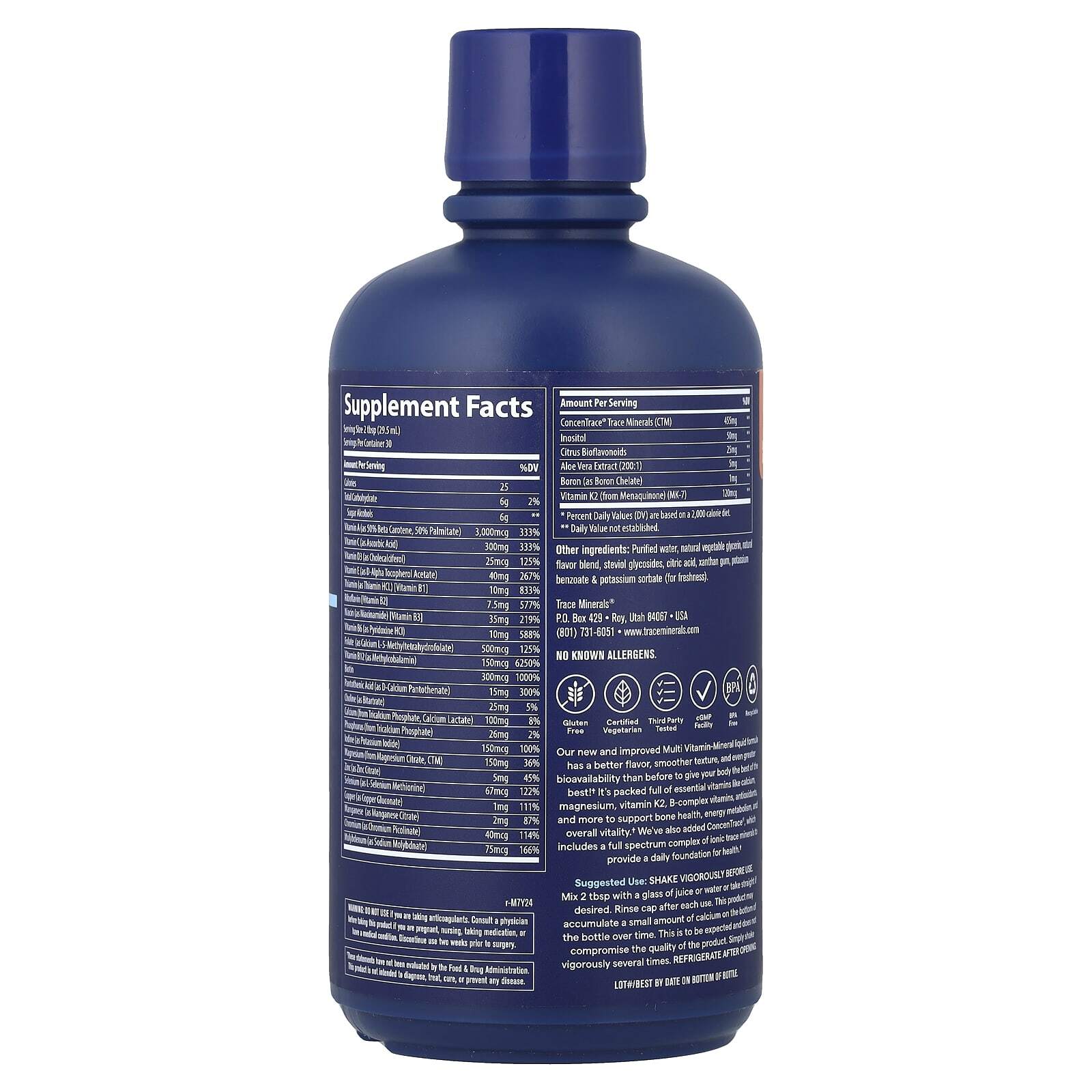 Наша новая улучшенная жидкая добавка с мультивитаминами и минералами имеет лучший вкус, более однородную текстуру и даже более высокую биодоступность, чем раньше, чтобы дать вашему организму всё самое лучшее! Она содержит необходимые витамины и минералы, такие как кальций, магний, витамин K2, комплекс витаминов группы B, антиоксиданты и другие ингредиенты, которые поддерживают здоровье костей, энергетический обмен и общую жизненную силу. Мы также добавили ConcenTrace® — комплекс ионных микроэлементов полного спектра, чтобы обеспечить ежедневную основу для здоровья.