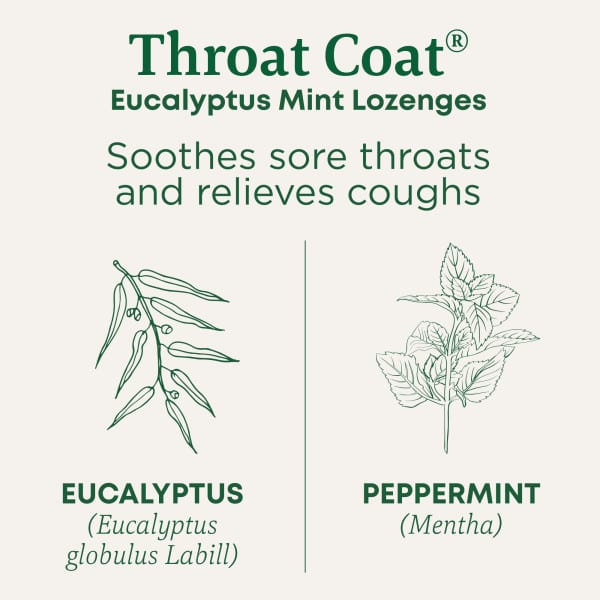 Чай Throat Coat теперь доступен в удобных леденцах. Эта уникальная формула сочетает в себе успокаивающий органический ментол для облегчения эпизодического кашля и боли в горле с органическими эфирными маслами перечной мяты и эвкалипта для придания мятного вкуса. Эти небольшие мощные леденцы обеспечивают облегчение, когда вам это нужно.