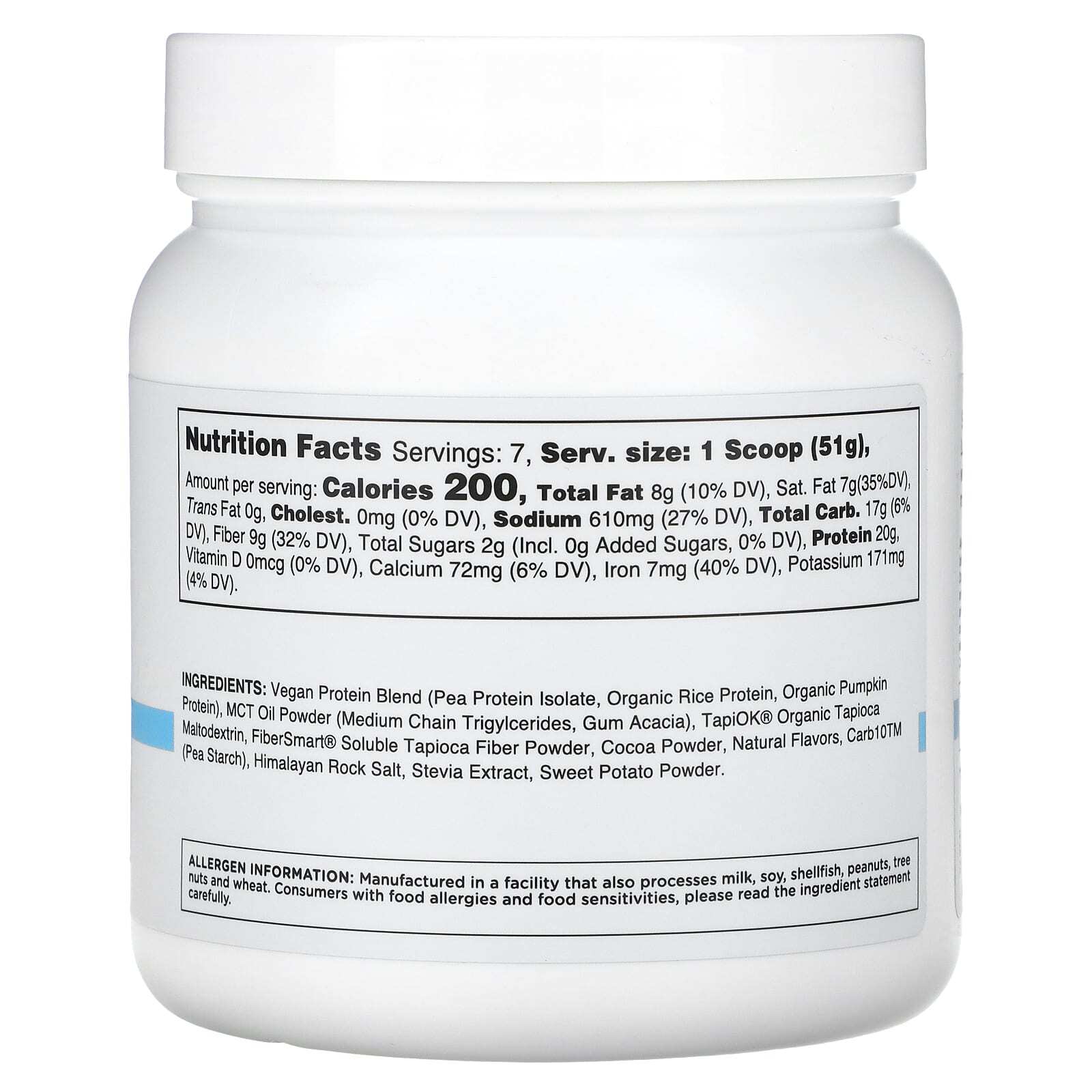 Смесь веганских белков (изолят горохового протеина, органический рисовый протеин, органический тыквенный белок), порошок из масла MCT (среднецепочечные триглицериды, аравийская камедь), мальтодекстрин из органической тапиоки TapiOK®, порошок из растворимой тапиоковой клетчатки FiberSmart®, какао-порошок, натуральные ароматизаторы, carb10™ (гороховый крахмал), гималайская каменная соль, экстракт стевии, порошок из батата.