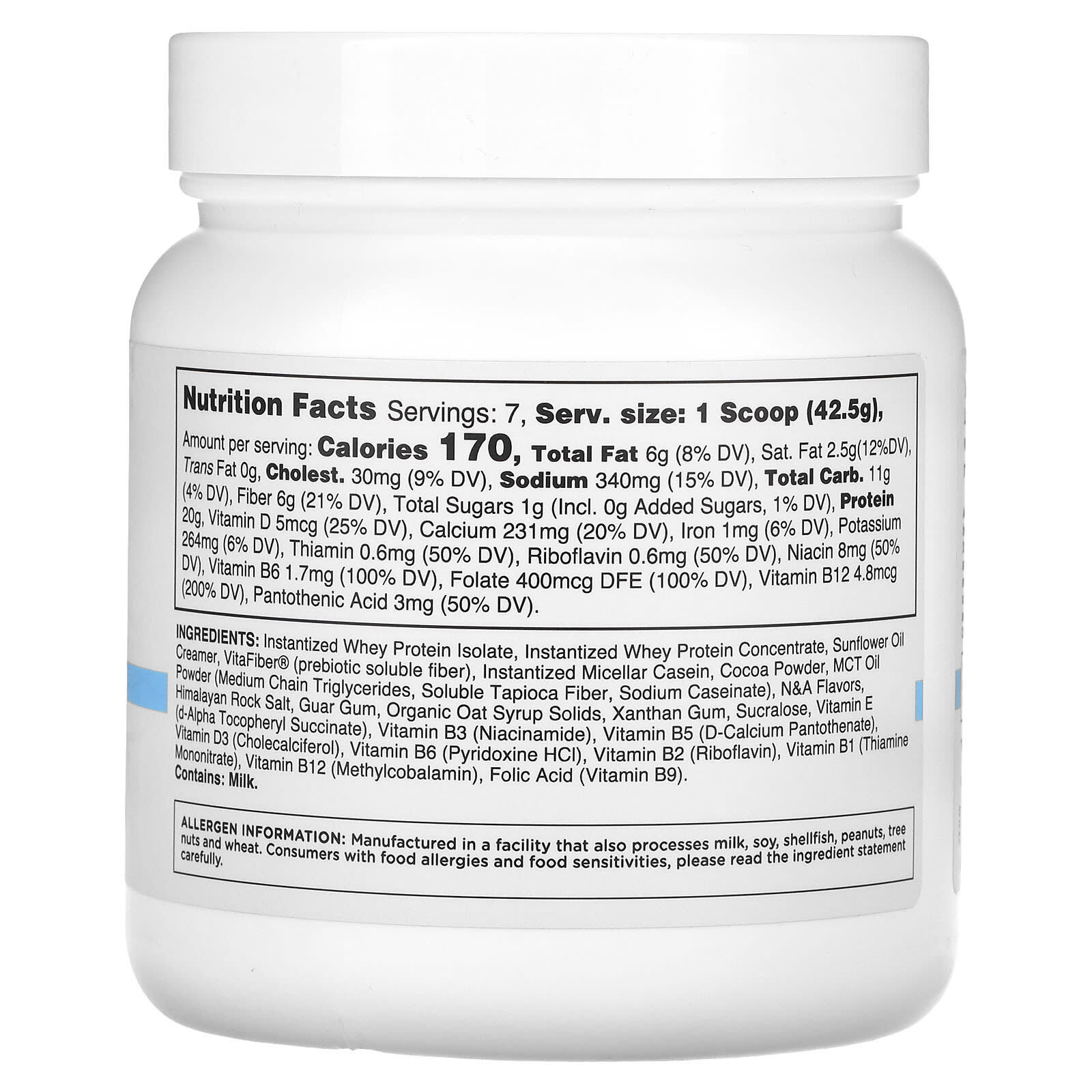 Быстрорастворимый изолят сывороточного протеина, быстрорастворимый концентрат сывороточного протеина, подсолнечное масло и сливки, VitaFiber® (пребиотическая растворимая клетчатка), мицеллярный казеин (растворимый мицеллярный казеин), какао-порошок, порошок из масла MCT (среднецепочечные триглицериды, растворимая тапиоковая клетчатка, казеинат натрия), ароматизаторы n&a, гималайская каменная соль, гуаровая камедь, сухие вещества органического овсяного сиропа, ксантановая камедь, сукралоза, витамин E(d-альфа токоферил сукцинат), витамин B3 (никотинамид), витамин B5 (d-пантотенат кальция), витамин D3 (холекальциферол), витамин B6 (пиридоксина гидрохлорид), витамин B2 (рибофлавин), витамин B1 (тиамина мононитрат), витамин B12 (метилкобаламин), фолиевую кислоту (витамин B9).