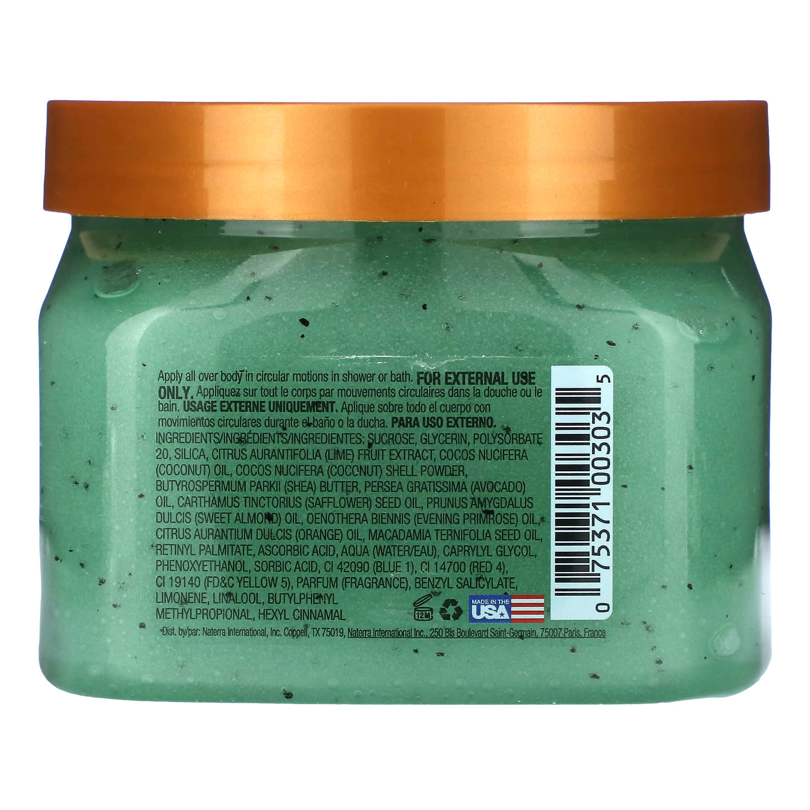 Сахароза, глицерин, полисорбат 20, диоксид кремния, экстракт плодов лайма (Citrus aurantifolia), кокосовое масло (Cocos nucifera), порошок из скорлупы кокоса (Cocos nucifera), масло ши (Butyrospermum parkii), масло авокадо (Persea gratissima), масло семян сафлора (Carthamus tinctorius), масло сладкого миндаля (Prunus amygdalus dulcis), масло примулы вечерней (Oenothera biennis), масло апельсина (Citrus aurantium dulcis), масло макадамии (Macadamia ternifolia), ретинилпальмитат, аскорбиновая кислота, вода (вода), каприлилгликоль, феноксиэтанол, сорбиновая кислота, CI 42090 (синий 1), CI 14700 (красный 4), CI 19140 (FD&C желтый 5), парфюмерная композиция (отдушка), бензилсалицилат, лимонен, линалоол, бутилфенил метилпропиональ, гексил циннамал.
