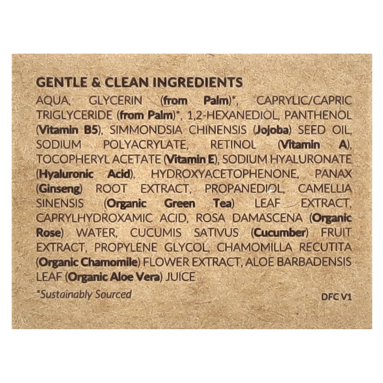 Вода, глицерин (из пальмы) * каприловый / каприновый триглицерид (из пальмы) *, 1,2-гександиол, пантенол (витамин B5), масло из семян жожоба (Simmondsia chinensis), полиакрилат натрия, ретинол (витамин А), токоферилацетат (витамин Е), гиалуронат натрия (гиалуроновая кислота), гидроксиацетофенон, экстракт корня женьшеня (Panax ginseng), пропандиол, экстракт листьев зеленого чая (Camellia sinensis), каприлгидроксамовая кислота, органическая розовая вода (дамасская роза [Rosa damascena]), экстракт плодов огурца (Cucumis sativus), пропиленгликоль, экстракт цветков ромашки (Chamomilla recutita), сок листьев алоэ вера (Aloe barbadensis).