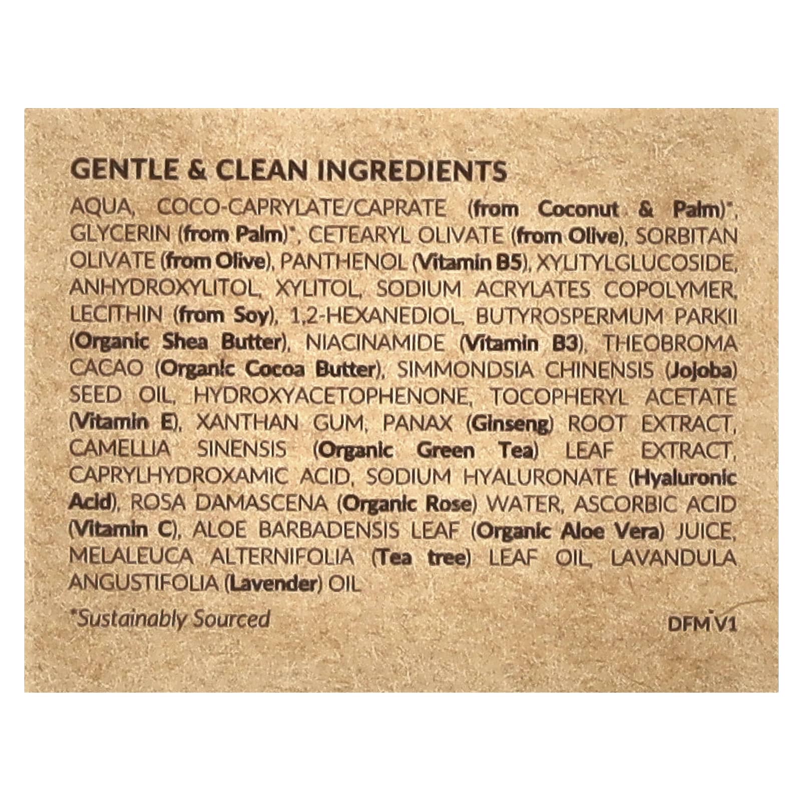 Вода, кококаприлат / капрат (из кокоса и пальмы) * глицерин (из пальмы) *, цетеарил оливат (из оливкового дерева), сорбитан оливат (из оливкового дерева), пантенол (витамин B5), ксилитилглюкозид, ангидроксилитол, ксилитол, сополимер акрилатов натрия, лецитин (из сои), 1,2-гександиол, органическое масло ши (Butyrospermum parkii), ниацинамид (витамин B3), органическое какао-масло (Theobroma cacao), масло из семян жожоба (Simmondsia chinensis), гидроксиацетофенон, токоферилацетат (витамин Е), ксантановая камедь, экстракт корня женьшеня (Panax ginseng), органический экстракт листьев зеленого чая (Camellia sinensis), каприлгидроксаминовая кислота, гиалуронат натрия (гиалуроновая кислота), органическая розовая вода (дамасская роза [Rosa damascena]), аскорбиновая кислота (витамин С), сок листьев органического алоэ вера (Aloe barbadensis), масло из листьев чайного дерева (Melaleuca alternifolia), масло лаванды (Lavandula angustifolia).
