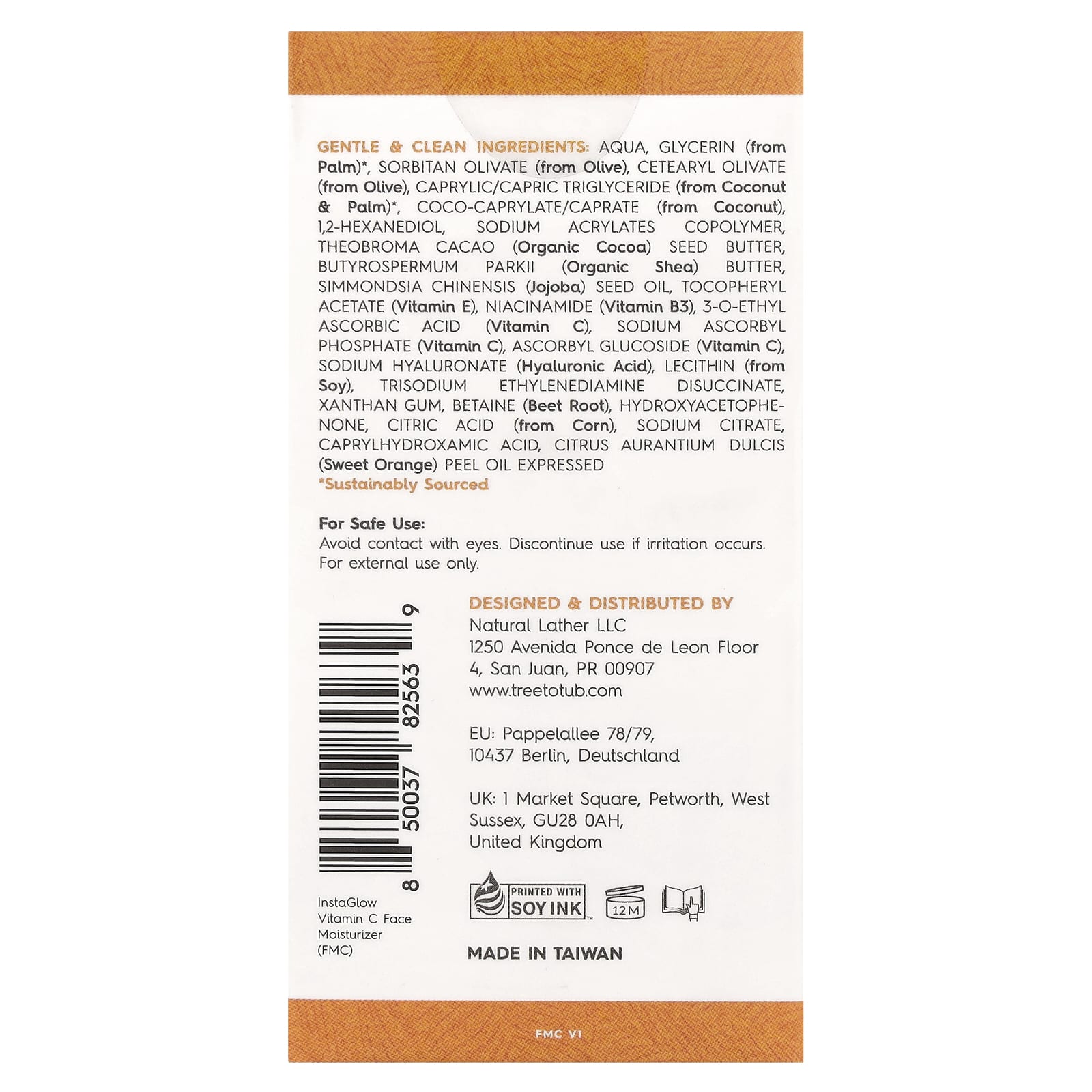 Вода, глицерин (из пальмы) *, сорбитан оливат (из оливкового дерева), цетеарил оливат (из оливкового дерева), каприловый / каприновый триглицерид (из кокоса и пальмы) *, кококаприлат / капрат (из кокоса), 1,2-гександиол, сополимер акрилатов натрия, масло из семян какао (Theobroma), масло ши (Butyrospermum parkii), масло из семян жожоба (Simmondsia chinensis), токоферилацетат (витамин Е), ниацинамид (витамин B3), 3-о-этил аскорбиновая кислота (витамин с), аскорбил фосфат натрия (витамин С), аскорбил глюкозид (витамин C), гиалуронат натрия (гиалуроновая кислота), лецитин (из сои), тринатрия этилендиамин дисукцинат, ксантановая камедь, бетаин (корень свеклы), гидроксиацетофенон, лимонная кислота (из кукурузы), цитрат натрия, каприлгидроксаминовая кислота, масло из цедры сладкого апельсина (Citrus aurantium dulcis).