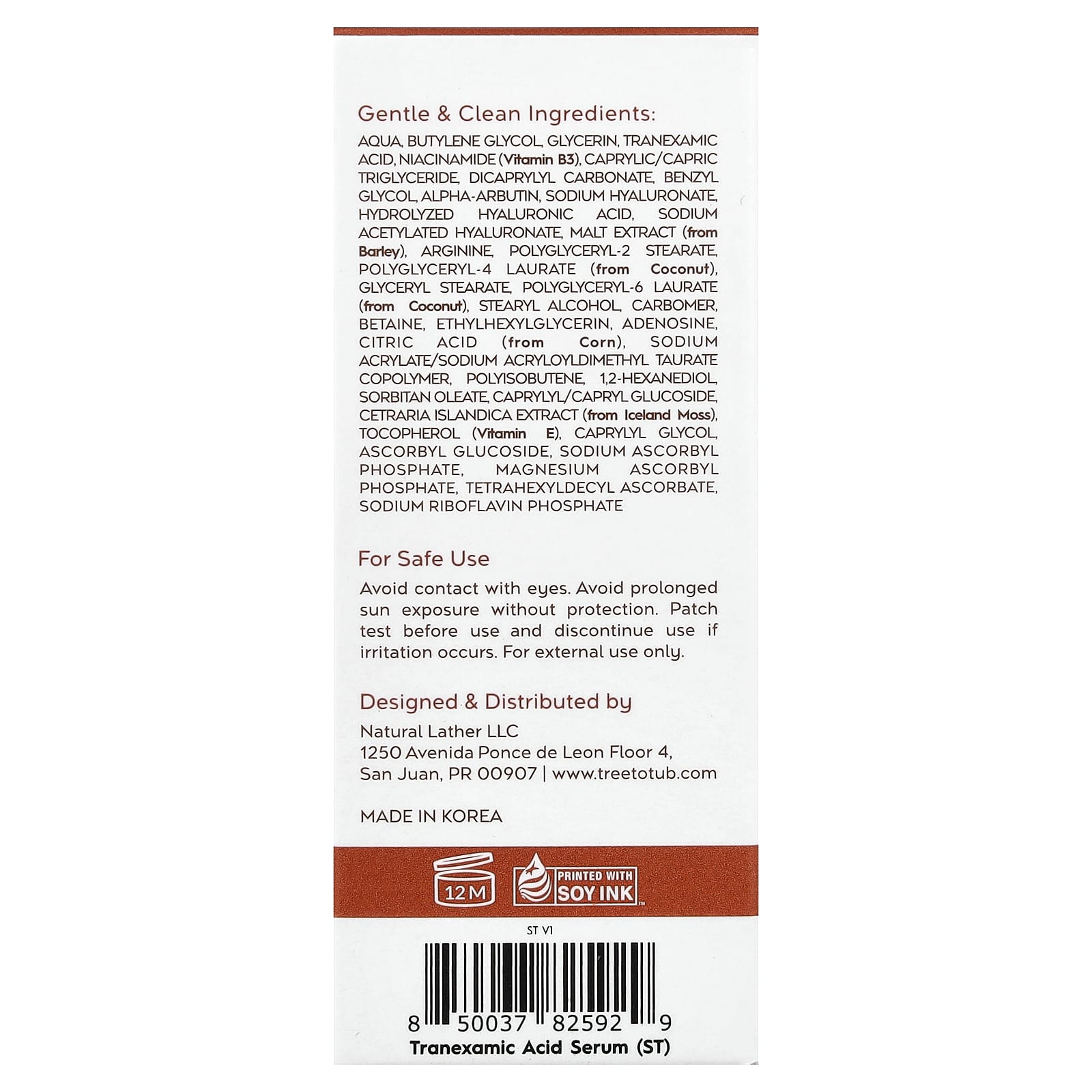 Вода, бутиленгликоль, глицерин, транексамовая кислота, ниацинамид (витамин B3), каприловый/каприновый триглицерид, дикаприлил карбонат, бензилгликоль, альфа-арбутин, гиалуронат натрия, гидролизованная гиалуроновая кислота, ацетилированный гиалуронат натрия, солодовый экстракт (из ячменя), аргинин, полиглицерил-2 стеарат, полиглицерил-4 лаурат (из кокоса), глицерил стеарат, полиглицерил-6 лаурат (из кокоса), стеариловый спирт, карбомер, бетаин, этилгексилглицерин, аденозин, лимонная кислота (из кукурузы), натрий акрилат/натрий акрилоилдиметилтаурат сополимер, полиизобутен, 1,2-гександиол, сорбитанолеат, каприлил/каприл глюкозид, экстракт цетрарии (из исландского мха), токоферол (витамин E), каприлилгликоль, аскорбил глюкозид, аскорбил фосфат натрия, аскорбилфосфат магния, тетрагексилдецил аскорбат, рибофлавин фосфат натрия.