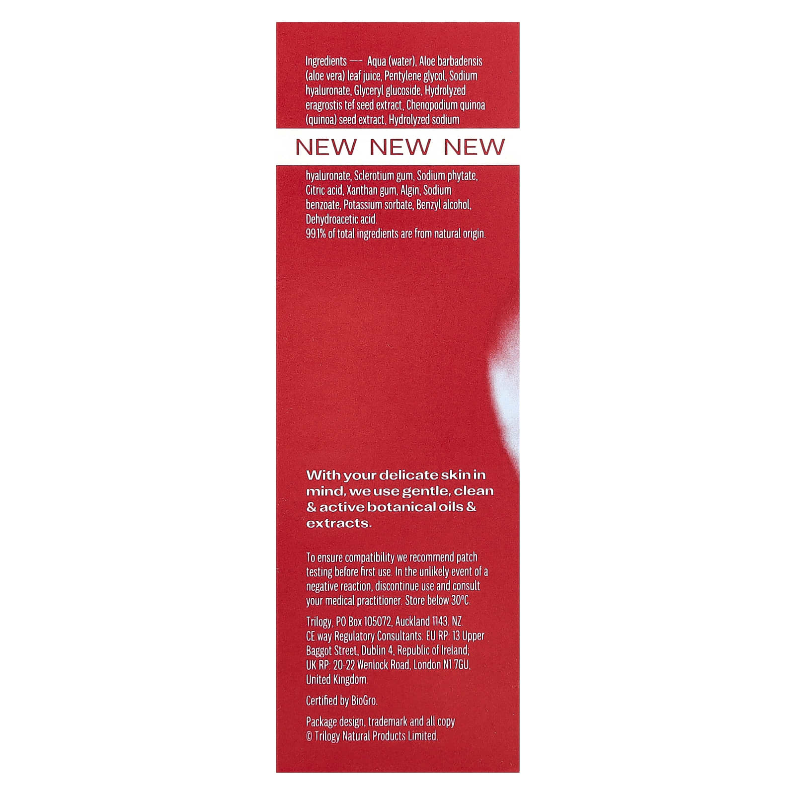 Вода (Aqua), сок листьев алоэ вера (Aloe barbadensis), пентилен гликоль, гиалуронат натрия, глицерил глюкозид, гидролизованный экстракт семян эрагростистефа, экстракт семян киноа (Chenopodium quinoa), гидролизованный гиалуронат натрия, смола склероций, фитат натрия, лимонная кислота, ксантановая камедь, альгин, бензоат натрия, сорбат калия, бензиловый спирт, дегидроуксусная кислота.