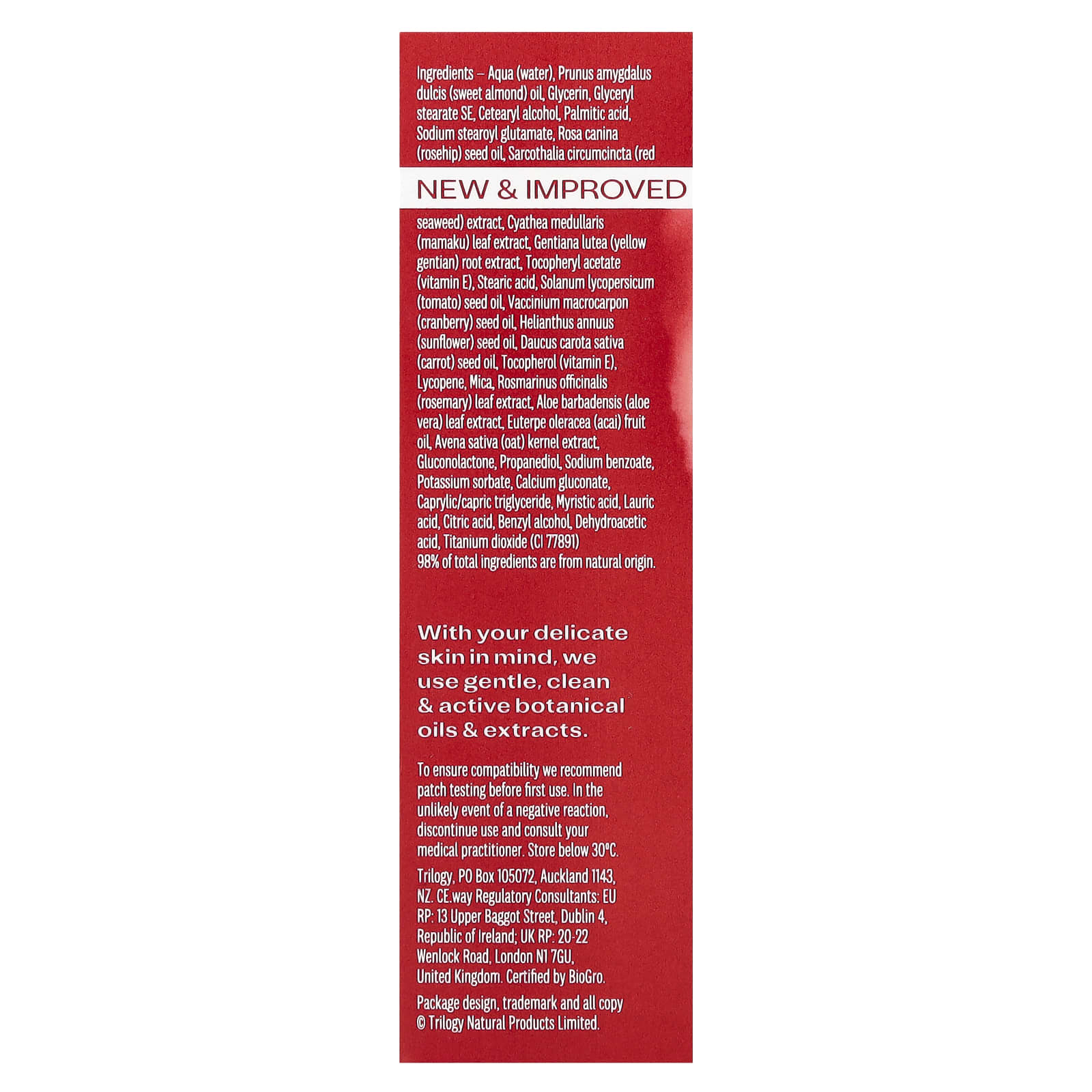 Вода (Aqua), масло сладкого миндаля (Prunus amygdalus dulcis), глицерин, глицерил стеарат эмульгирующий, цетеариловый спирт, пальмитиновая кислота, натрия стеароил глутамат, масло из семян шиповника (Rosa canina), экстракт красных морских водорослей (SarcothaliaCircumcincta), экстракт листьев киатеи (Cyathea medullaris), экстракт корня горечавки (Gentiana lutea), токоферилацетат (витамин Е), стеариновая кислота, масло из семян томата (Solanum lycopersicum), масло из семян клюквы (Vaccinium macrocarpon), подсолнечное масло (Helianthus annuus), масло из семян моркови (Daucus carota sativa), токоферол (витамин Е), ликопин, слюда, экстракт листьев розмарина (Rosmarinus officinalis), экстракт листьев алоэ вера (Aloe vera), экстракт ягод асаи (Euterpe oleracea), экстракт ядер овса (Avena sativa), глюконолактон, пропандиол, бензоат натрия, сорбат калия, глюконат кальция, каприловый/каприновый триглицерид, миристиновая кислота, лауриновая кислота, лимонная кислота, бензиловый спирт, дегидроуксусная кислота, диоксид титана (CI 77891).