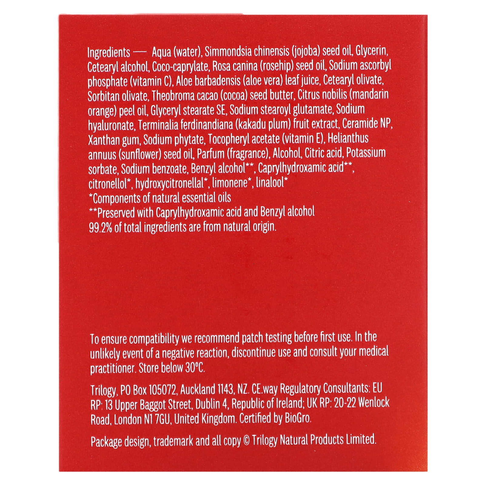 Вода (Aqua), масло из семян жожоба (Simmondsia chinensis), глицерин, цетеариловый спирт, кококаприлат, масло из семян шиповника (Rosa canina), аскорбил фосфат натрия (витамин C), сок листьев алоэ вера (Aloe barbadensis), цетеарил оливат, сорбитан оливат, масло зерен какао (Theobroma cacao), масло из цедры мандарина (Citrus nobilis), глицерил стеарат эмульгирующий, натрия стеароил глутамат, гиалуронат натрия, экстракт плодов сливы какаду (Terminalia ferdinandiana), керамид NP, ксантановая камедь, фитат натрия, токоферилацетат (витамин Е), подсолнечное масло (Helianthus annuus), парфюмерная композиция (отдушка), спирт, лимонная кислота, сорбат калия, бензоат натрия, бензиловый спирт**, каприлгидроксамовая кислота * цитронеллол *, гидроксицитронеллаль*, лимонен*, линалоол*.