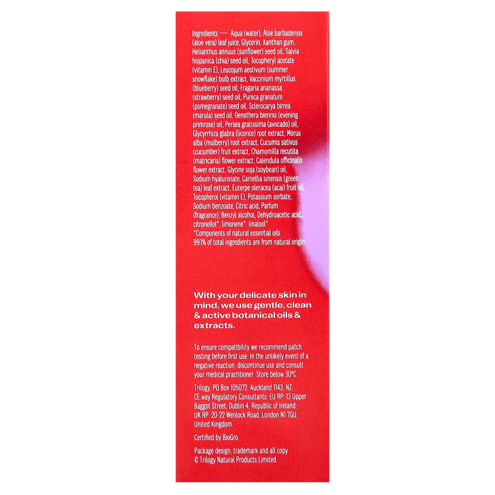 Вода (Aqua), сок листьев алоэ вера (Aloe barbadensis), глицерин, ксантановая камедь, подсолнечное масло (Helianthus annuus), масло из семян чиа (Salvia hispanica), токоферилацетат (витамин Е), экстракт луковиц снежника летнего (Leucojum aestivum), масло из семян черники (Vaccinium myrtillus), масло из семян клубники (Fragaria ananassa), масло из косточек граната (Punica granatum), масло из семян марулы (Sclerocarya birrea), масло примулы вечерней (Oenothera biennis), масло авокадо (Persea gratissima), экстракт корня солодки (Glycyrrhiza glabra), экстракт корня шелковицы (Morus alba), экстракт плодов огурца (Cucumis sativus), экстракт цветков ромашки (Chamomilla recutita), экстракт цветков календулы (Calendula officinalis), соевое масло (Glycine soja), гиалуронат натрия, экстракт листьев зеленого чая (Camellia sinensis), экстракт ягод асаи (Euterpe oleracea), токоферол (витамин Е), сорбат калия, бензоат натрия, лимонная кислота, парфюмерная композиция (отдушка), бензиловый спирт, дегидроуксусная кислота, цитронеллол*, лимонен*, линалоол*.