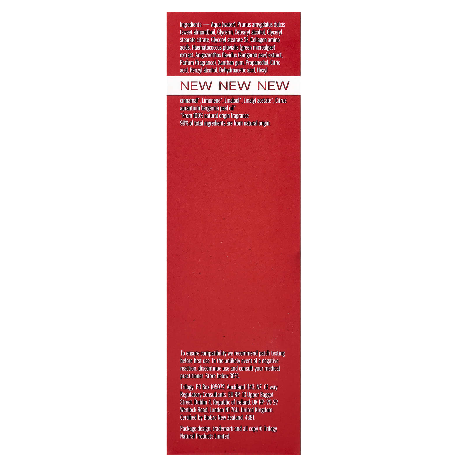 Вода, масло сладкого миндаля (Prunus amygdalus dulcis), глицерин, цетеариловый спирт, глицерил стеарат цитрат, глицерил стеарат эмульгирующий, коллагеновые аминокислоты, экстракт зеленых микроводорослей (Haematococcus pluvialis), экстракт лапы кенгуру (Anigozanthos flavidus), парфюмерная композиция (отдушка), ксантановая камедь, пропандиол, лимонная кислота, бензиловый спирт, дегидроуксусная кислота, гексил циннамал*, лимонен*, линалоол*, линалил ацетат*, масло из цедры апельсина (Citrus aurantium bergamia)*.
