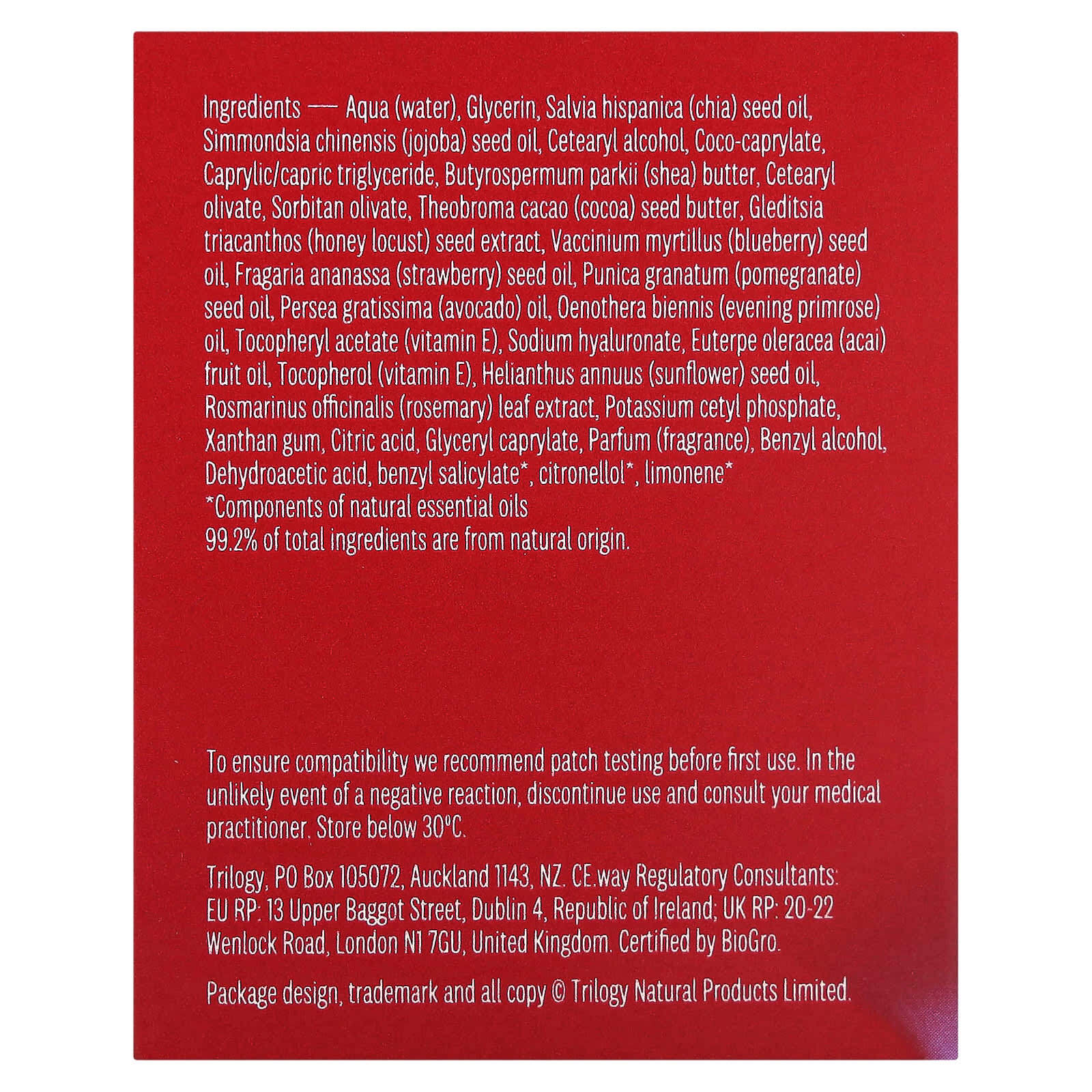 Вода (Aqua), глицерин, масло из семян чиа (Salvia hispanica), масло из семян жожоба (Simmondsia chinensis), цетеариловый спирт, кококаприлат, каприловый/каприновый триглицерид, масло ши (Butyrospermum parkii), цетеарил оливат, сорбитан оливат, масло из зерен какао (Theobroma cacao), экстракт семян акации гледичии (Gleditsia triacanthos), масло из семян черники (Vaccinium myrtillus), масло из семян клубники (Fragaria ananassa), масло из косточек граната (Punica granatum), масло авокадо (Persea gratissima), масло примулы вечерней (Oenothera biennis), токоферилацетат (витамин E), гиалуронат натрия, экстракт ягод асаи (Euterpe oleracea), токоферол (витамин Е), подсолнечное масло (Helianthus annuus), экстракт листьев розмарина (Rosmarinus officinalis), цетил фосфат калия, ксантановая камедь, лимонная кислота, глицерил каприлат, парфюмерная композиция (отдушка), бензиловый спирт, дегидроуксусная кислота, бензилсалицилат*, цитронеллол*, лимонен*.