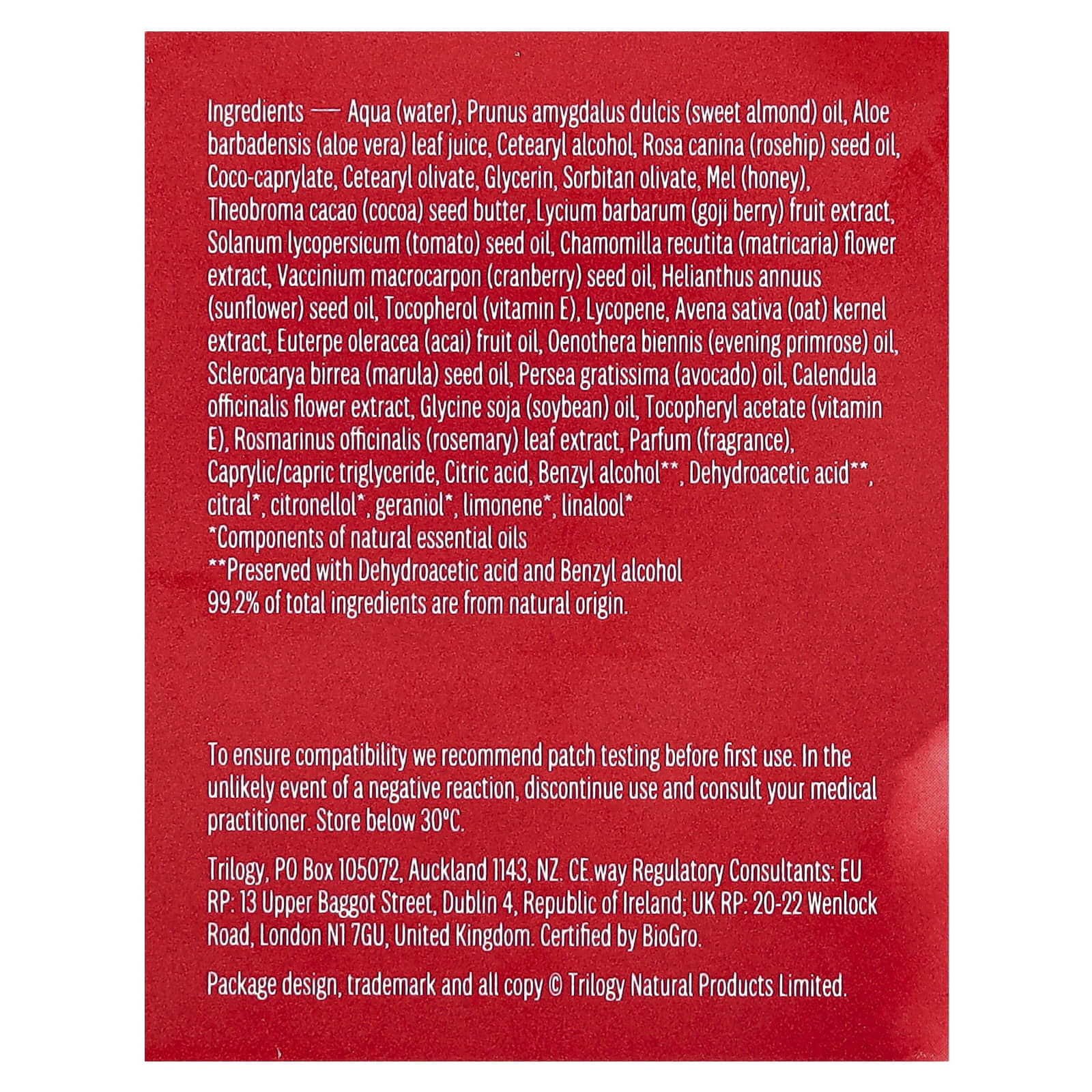 Вода (Aqua), масло сладкого миндаля (Prunus amygdalus dulcis), сок листьев алоэ вера (Aloe barbadensis), цетеариловый спирт, масло из семян шиповника (Rosa canina), кококаприлат, цетеарил оливат, глицерин, сорбитан оливат, мед, масло из зерен какао (Theobroma cacao), экстракт ягод годжи (Lycium barbarum), масло семян томата (Solanum lycopersicum), экстракт цветков ромашки лекарственной (Chamomilla recutita), масло семян клюквы (Vaccinium macrocarpon), подсолнечное масло (Helianthus annuus), токоферол (витамин Е), ликопин, экстракт ядер овса (Avena sativa), масло плодов асаи (Euterpe oleracea), масло примулы вечерней (Oenothera biennis), масло семян марулы (Sclerocarya birrea), масло авокадо (Persea gratissima), экстракт цветков календулы (Calendula officinalis), соевое масло (Glycine soja), токоферилацетат (витамин Е), экстракт листьев розмарина (Rosmarinus officinalis), парфюмерная композиция (отдушка), каприловый/каприновый триглицерид, лимонная кислота, бензиловый спирт **, дегидроуксусная кислота **, цитраль *, цитронеллол *, гераниол *, лимонен *, линалоол*.