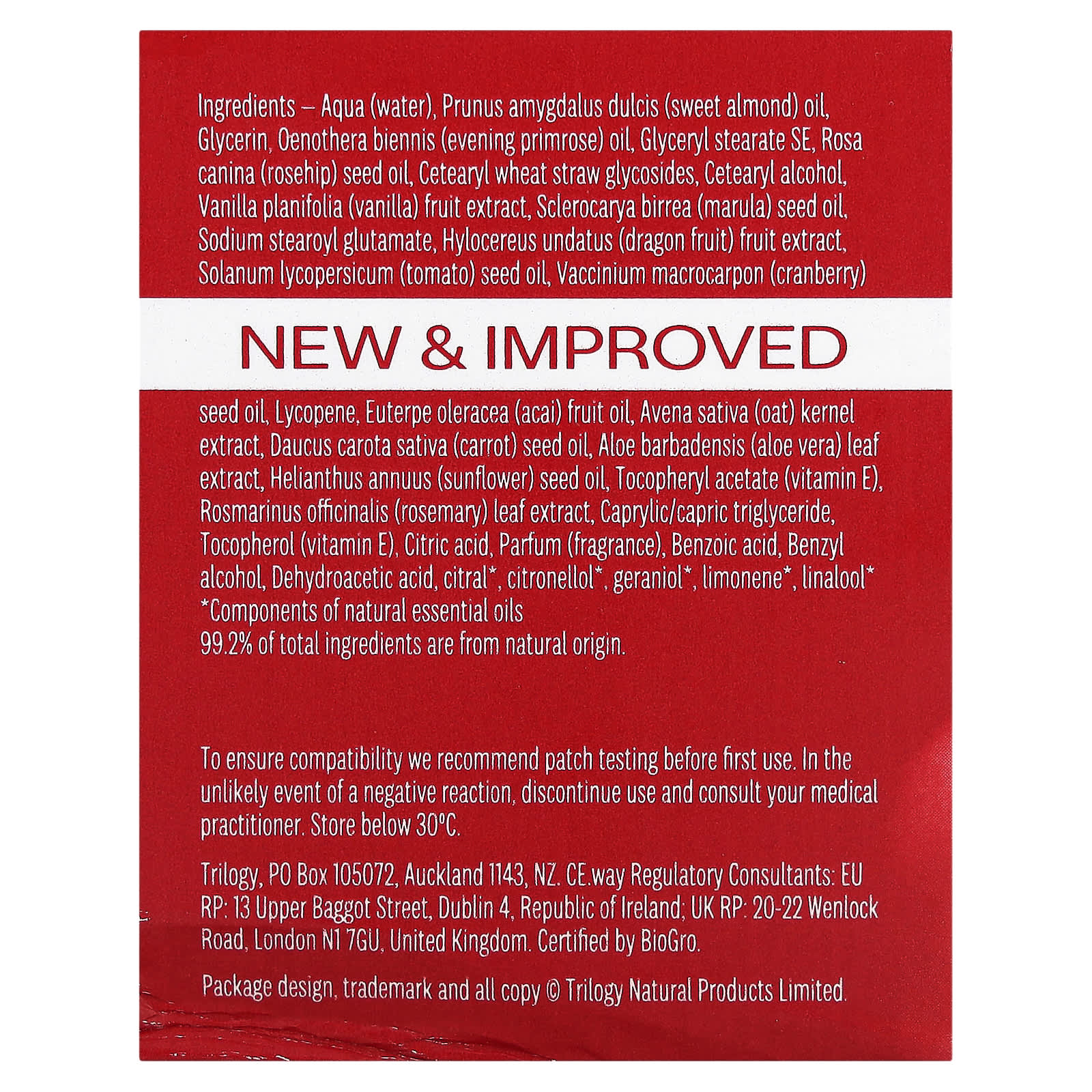 Вода (Aqua), масло сладкого миндаля (Prunus amygdalus dulcis), глицерин, масло примулы вечерней (Oenothera biennis), глицерил стеарат эмульгирующий, масло из семян шиповника (Rosa canina), цетеариловые гликозиды из пшеничной соломы, цетеариловый спирт, экстракт ванили (Vanilla planifolia), масло из семян марулы (Sclerocarya birrea), натрия стеароил глутамат, экстракт плодов питайи (Hylocereus undatus), масло из семян томата (Solanum lycopersicum), масло из семян клюквы (Vaccinium macrocarpon), ликопин, экстракт ягод асаи (Euterpe oleracea), экстракт ядер овса (Avena sativa), масло из семян моркови (Daucus carota sativa), экстракт листьев алоэ вера (Aloe vera), подсолнечное масло (Helianthus annuus), токоферилацетат (витамин E), экстракт листьев розмарина (Rosmarinus officinalis), каприловый/каприновый триглицерид, токоферол (витамин Е), лимонная кислота, парфюмерная композиция (отдушка), бензойная кислота, бензиловый спирт, дегидроуксусная кислота, цитраль*, цитронеллол*, гераниол*, лимонен*, линалоол*.