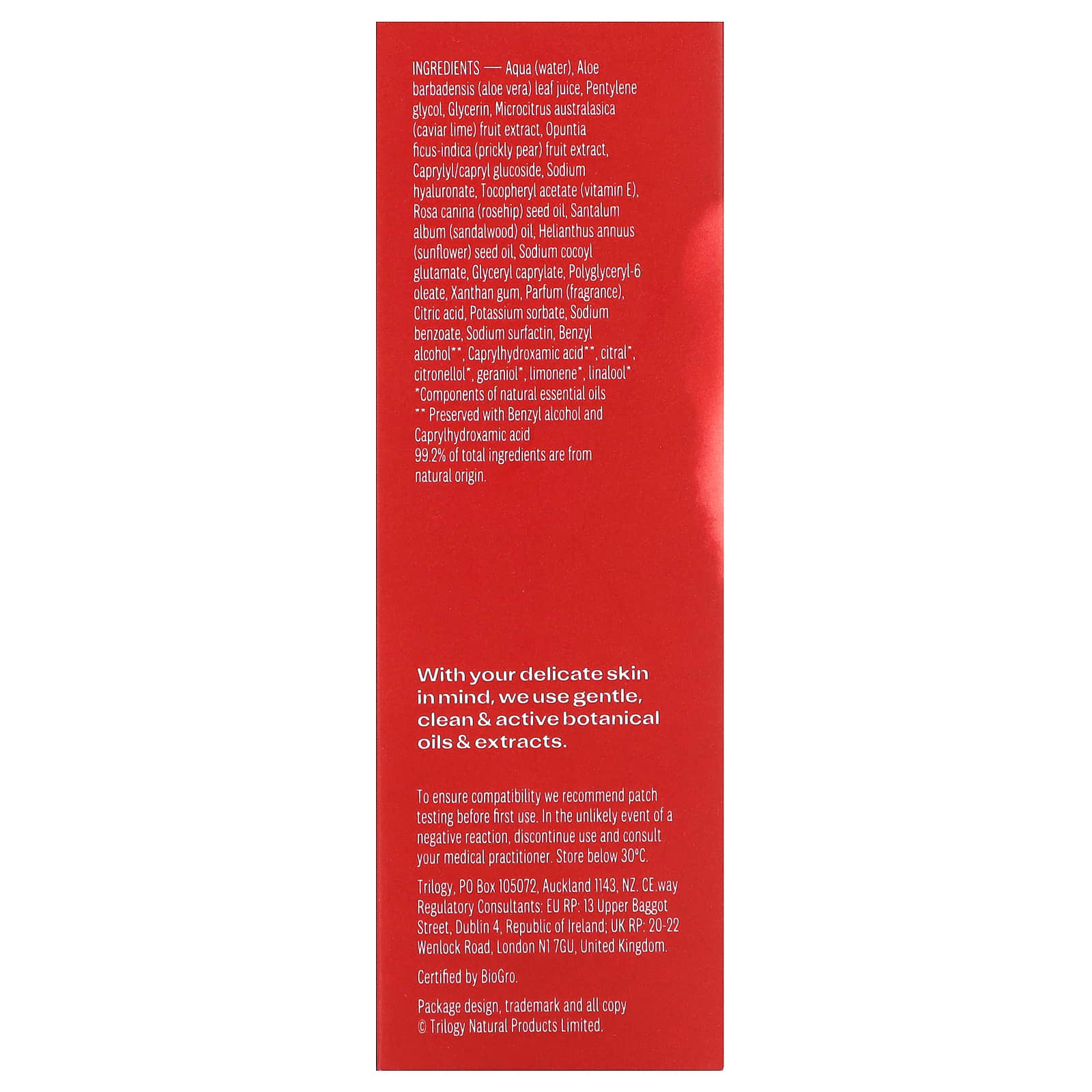 Вода (Aqua), сок листьев алоэ вера (Aloe barbadensis), пентилен гликоль, глицерин, экстракт плодов икры австраласской (Microcitrus australasica), экстракт плодов опунции (Opuntia ficus-indica), каприлил/каприл глюкозид, гиалуронат натрия, токоферилацетат (витамин E), масло из семян шиповника (Rosa canina), масло сандалового дерева (Santalum album), подсолнечное масло (Helianthus annuus), кокоил глутамат натрия, глицерил каприлат, полиглицерил-6-олеат, ксантановая камедь, парфюмерная композиция (отдушка), лимонная кислота, сорбат калия, бензоат натрия, сурфактин натрия, бензиловый спирт **, каприлгидроксамовая кислота **, цитраль *, цитронеллол *, гераниол *, лимонен*, линалоол*.