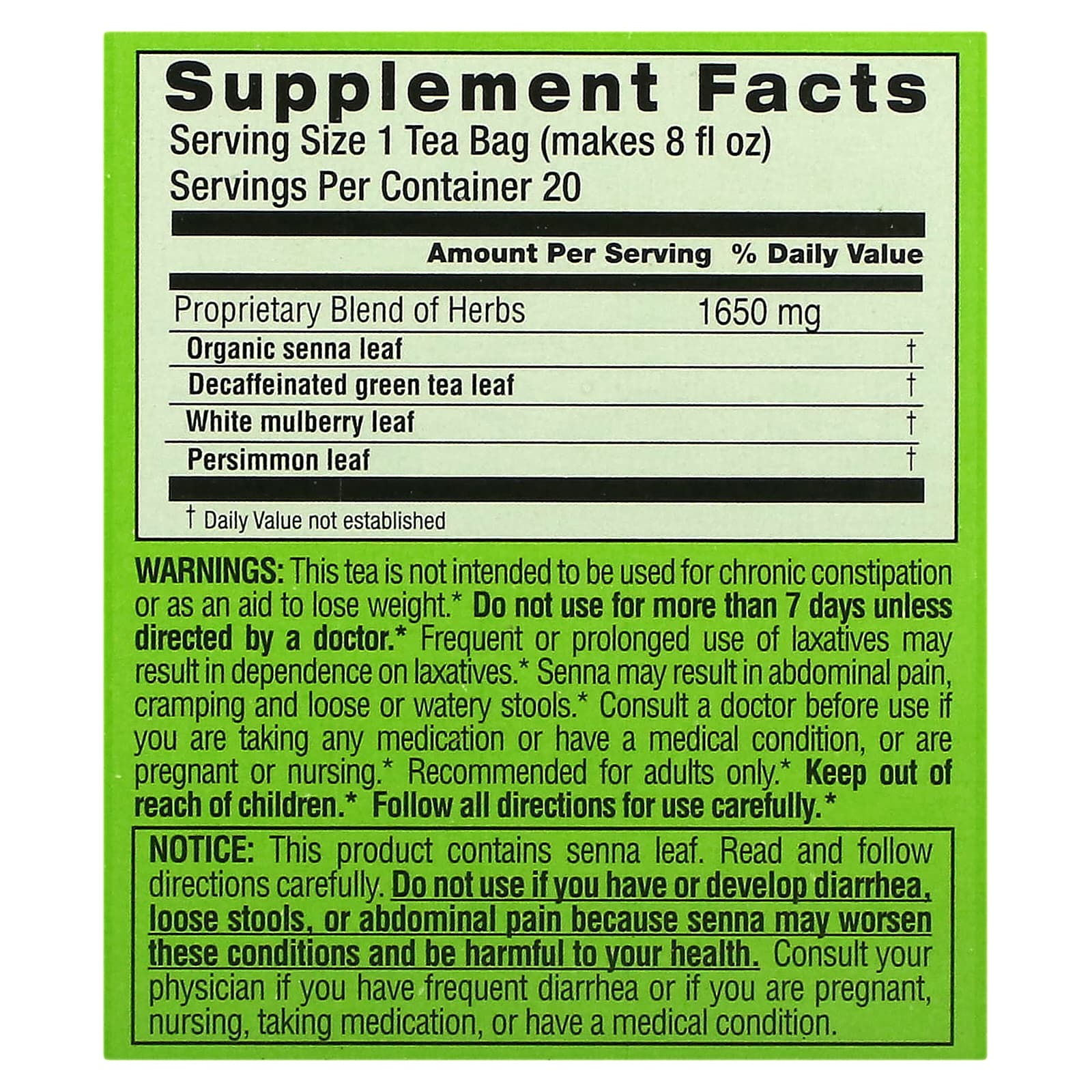 Этот чай не предназначен для употребления при хронических запорах или с целью снижения веса. Не принимать дольше 7 дней без рекомендации врача. Частое или длительное употребление слабительных может привести к зависимости от них. Сенна может вызвать боль в животе, спазмы и жидкий или водянистый стул. Перед началом применения во время беременности, кормления грудью, приема препаратов или при наличии каких-либо заболеваний следует проконсультироваться с врачом. Продукт предназначен только для взрослых. Хранить в недоступном для детей месте. Тщательно следуйте всем инструкциям по применению.