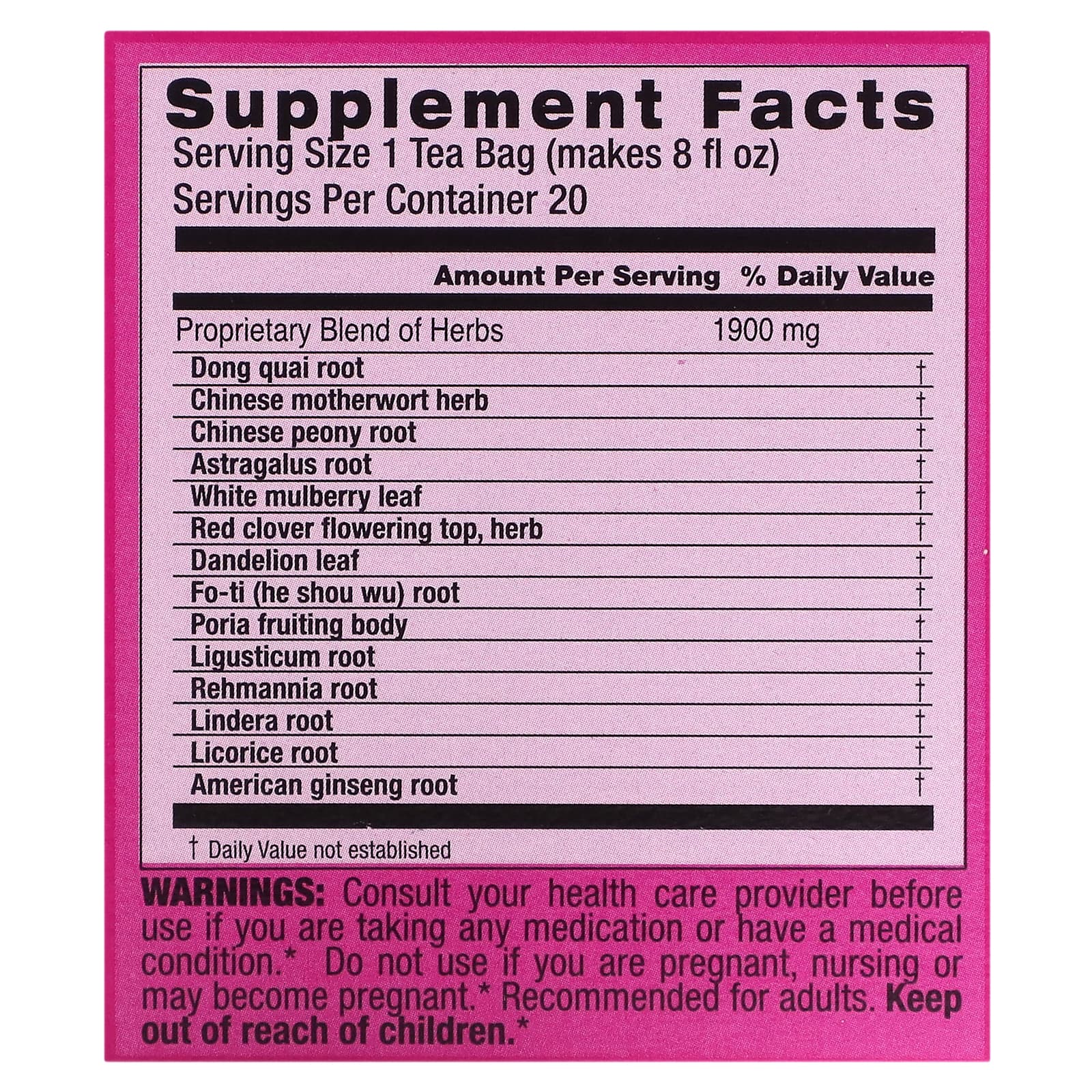 | Размер порции: 1 чайный пакетик [на 240 мл (8 жидк. унций)] | ||