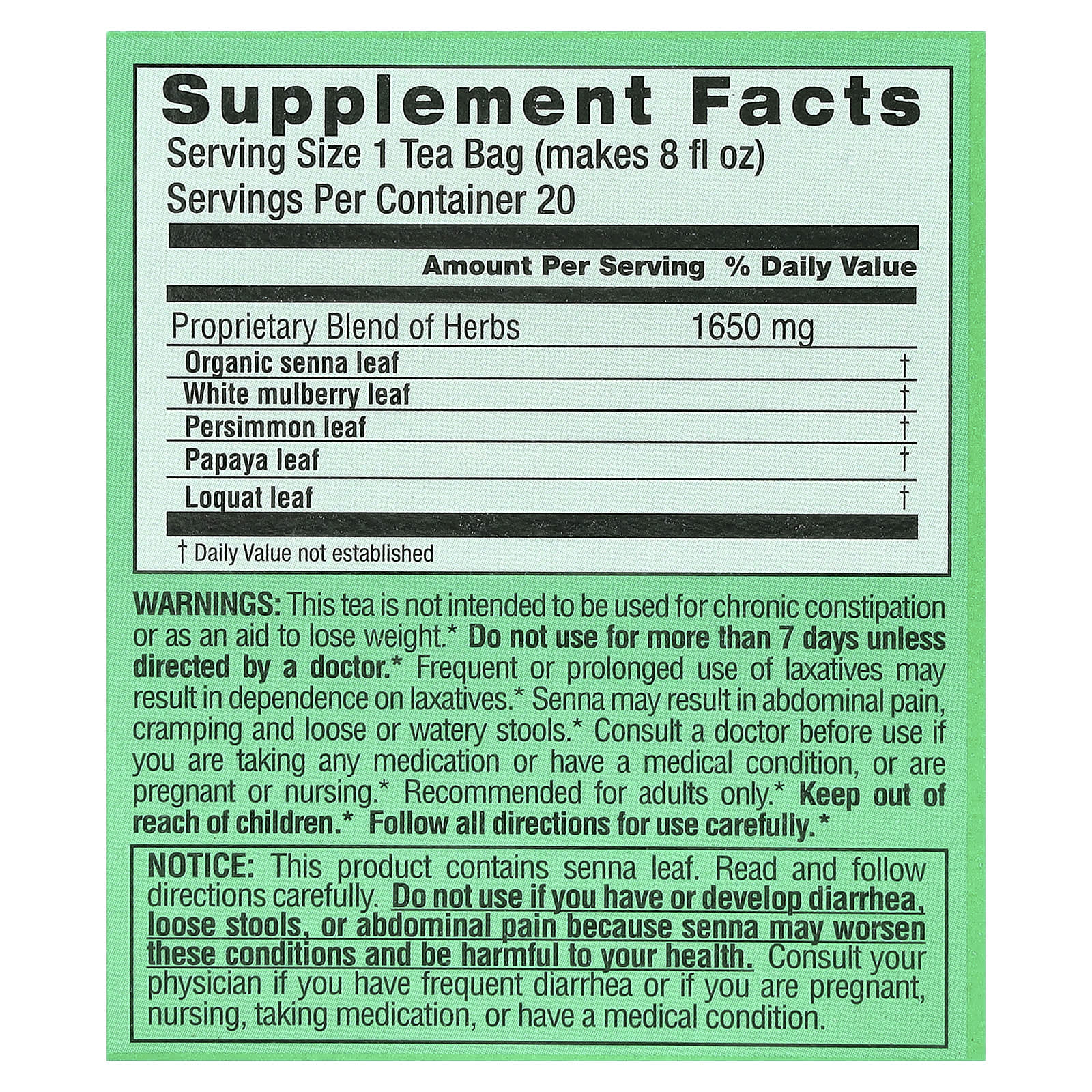 Этот чай не предназначен для использования при хронических запорах или в качестве средства для снижения веса. Не используйте более 7 дней подряд без указания врача. Частое или длительное использование слабительных средств может привести к зависимости от слабительных средств. Сенна может вызвать боль в животе, спазмы и жидкий или водянистый стул. Перед началом применения во время приема каких-либо препаратов, при наличии заболеваний, во время беременности или кормления грудью следует проконсультироваться с врачом. Рекомендуется только для взрослых. Хранить в недоступном для детей месте. В точности выполняйте все инструкции по применению.