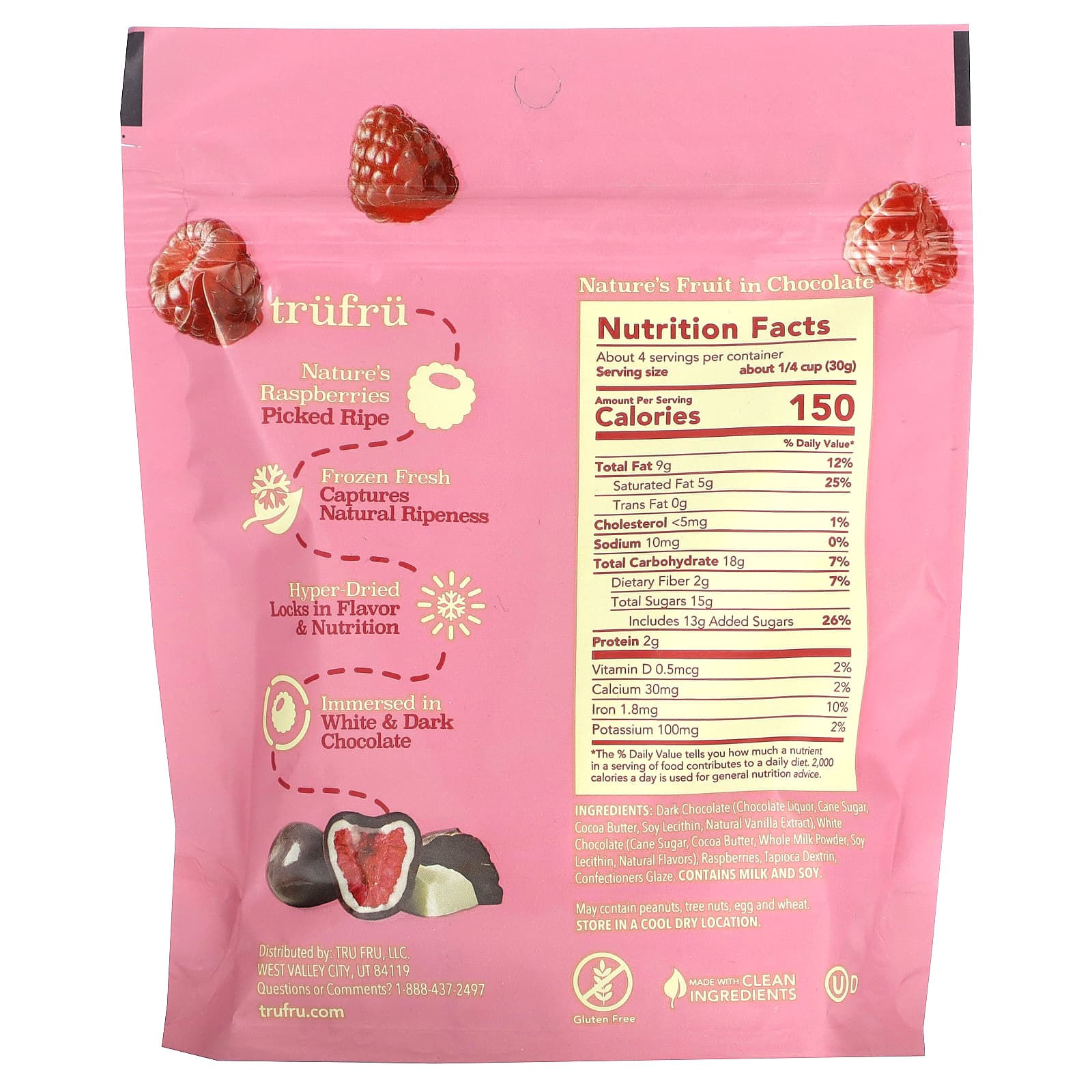 Темный шоколад (тертое какао, тростниковый сахар, какао-масло, лецитин из сои, натуральный ванильный экстракт), белый шоколад (тростниковый сахар, какао-масло, сухое цельное молоко, соевый лецитин, натуральные ароматизаторы), малина, тапиоковый декстрин, кондитерская глазурь.