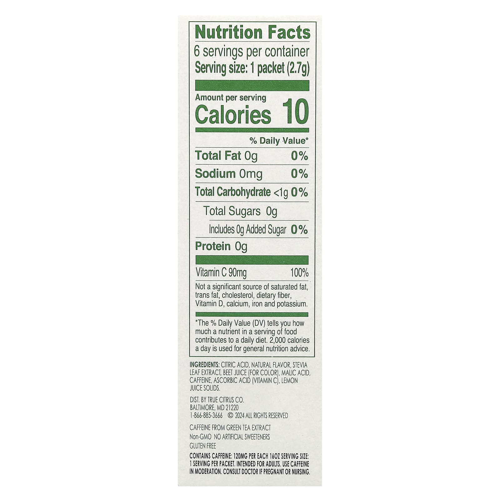 Лимонная кислота, натуральный ароматизатор, экстракт листьев стевии, свекольный сок (для цвета), яблочная кислота, кофеин, аскорбиновая кислота (витамин C), сухие вещества лимонного сока.