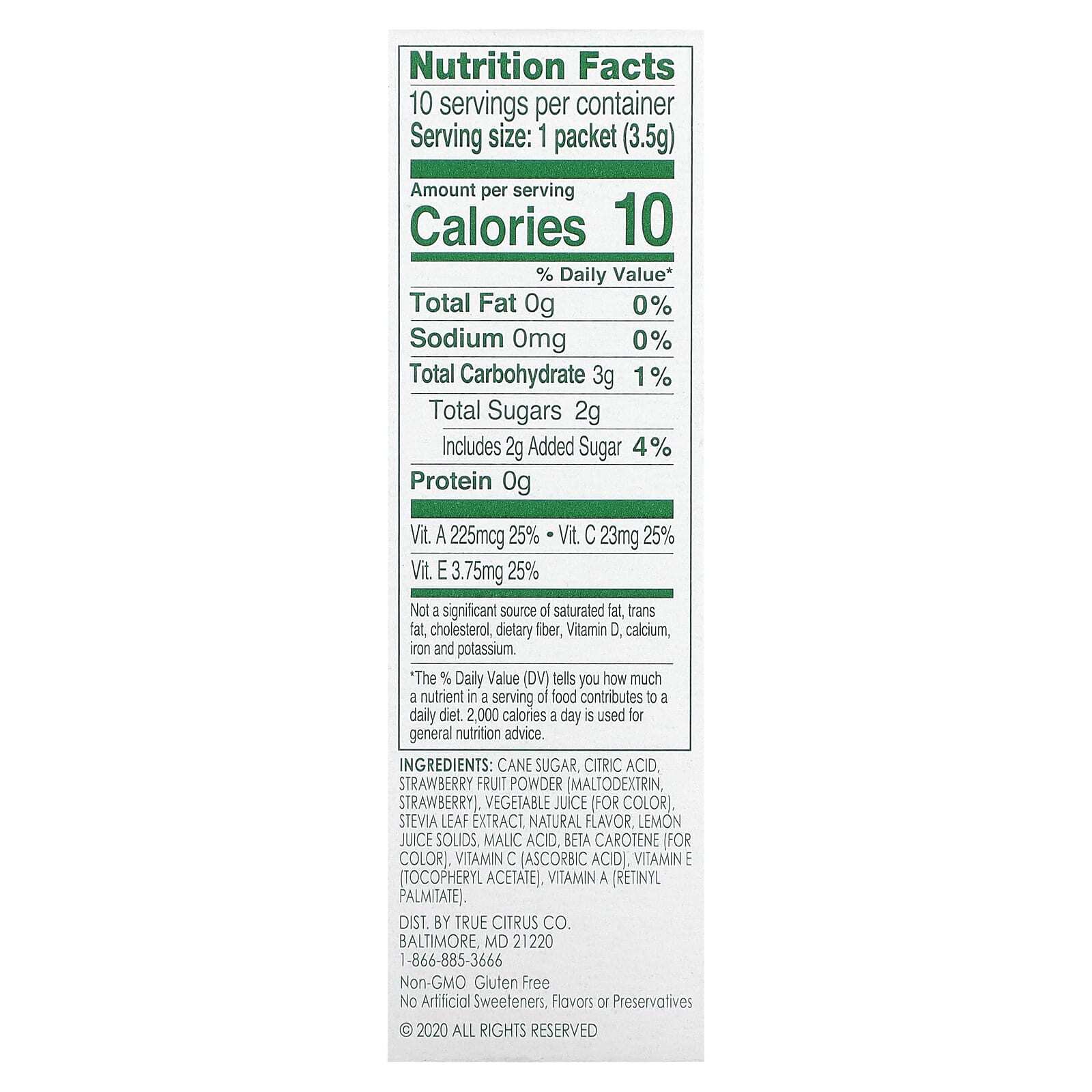 Тростниковый сахар, лимонная кислота, порошок из плодов клубники (мальтодекстрин, клубника), сок из овощей (краситель), экстракт листьев стевии, натуральный ароматизатор, сухие вещества лимонного сока, яблочная кислота, бета-каротин (краситель), витамин С (аскорбиновая кислота), витамин Е (токоферилацетат), витамин А (ретинилпальмитат).