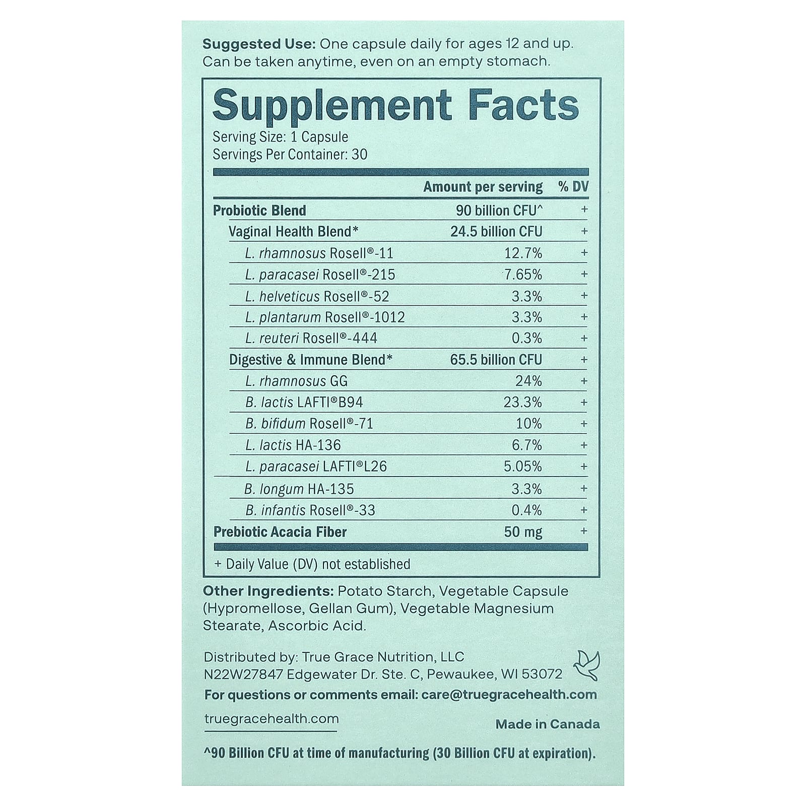 Пробиотики True Grace упакованы в запатентованный флакон CSP™ длительного хранения, который защищает пробиотические культуры от влаги, света и кислорода, что продлевает срок годности и обеспечивает стабильность продукта.
