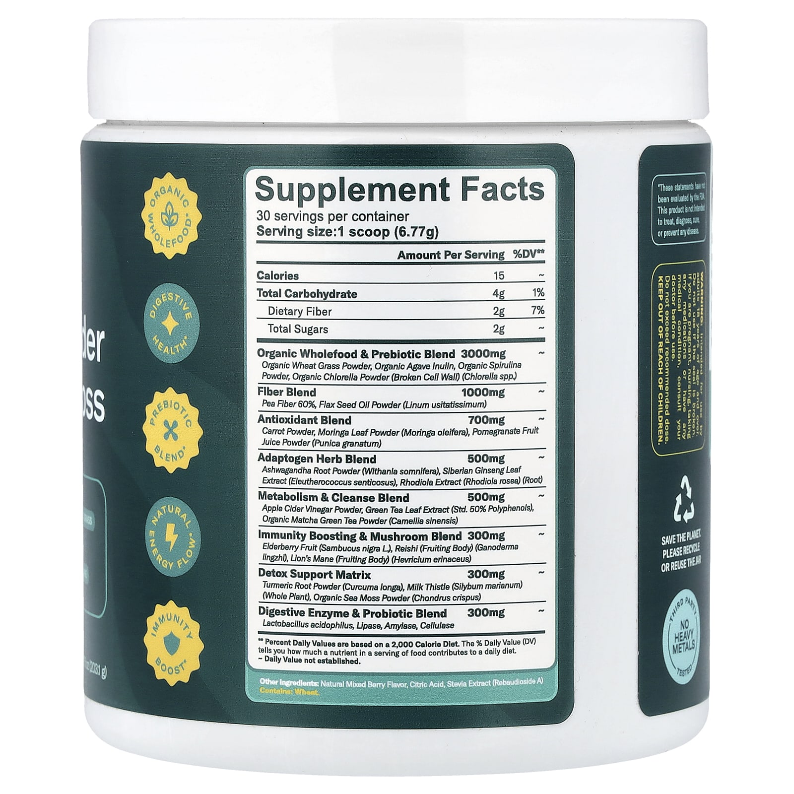 | Смесь органических цельных продуктов и пребиотиков Порошок из органических ростков пшеницы, инулин из органической агавы, порошок из органической спирулины, порошок из органической хлореллы (с разрушенной клеточной оболочкой) (вид Chlorella) | 3 000 мг | ~ |