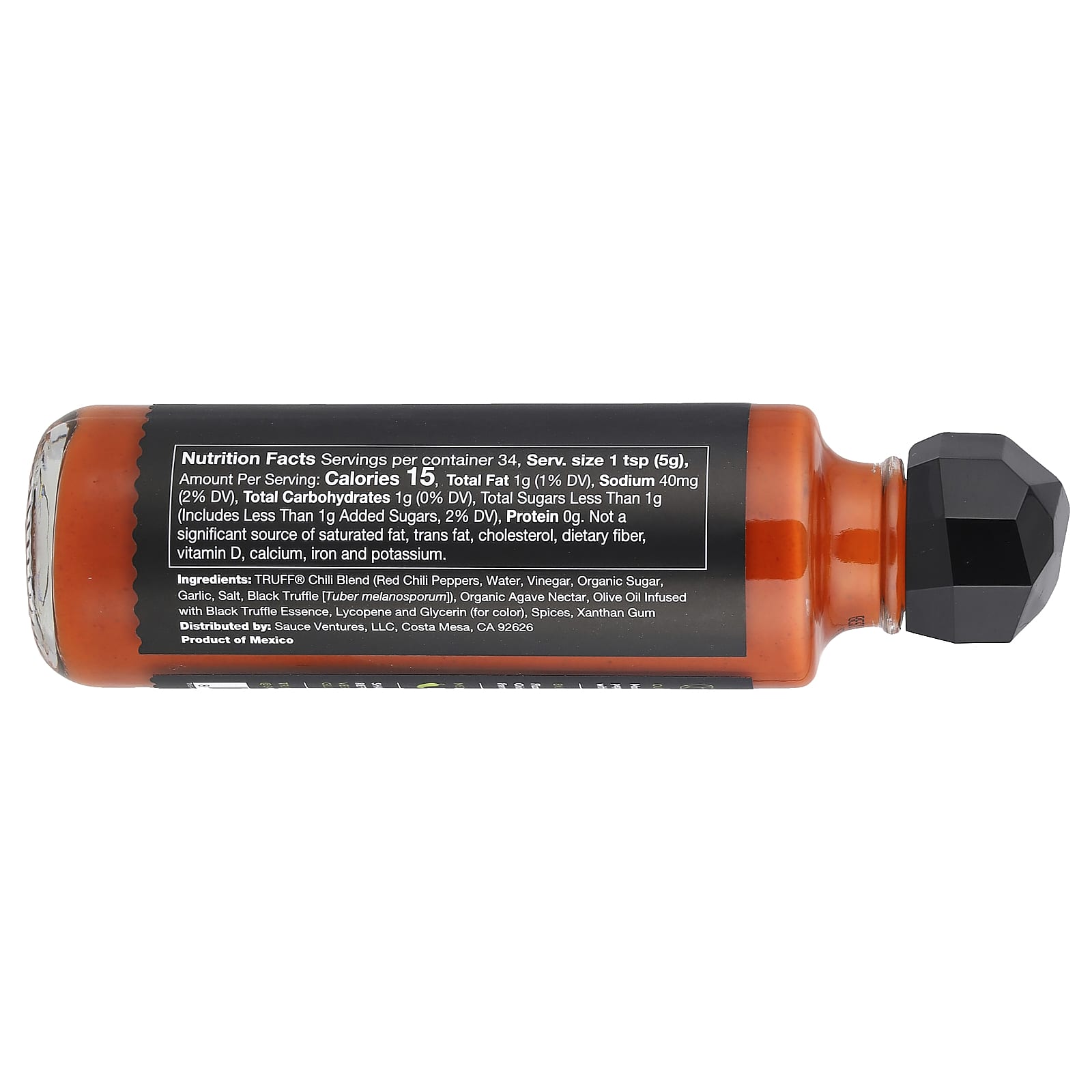 Смесь чили Truff® (красный перец чили, вода, уксус, органический сахар, чеснок, соль, черный трюфель [Tuber melanosporum]), нектар органической агавы, оливковое масло с экстрактом черного трюфеля, ликопин и глицерин (для окрашивания), специи, ксантановая камедь.