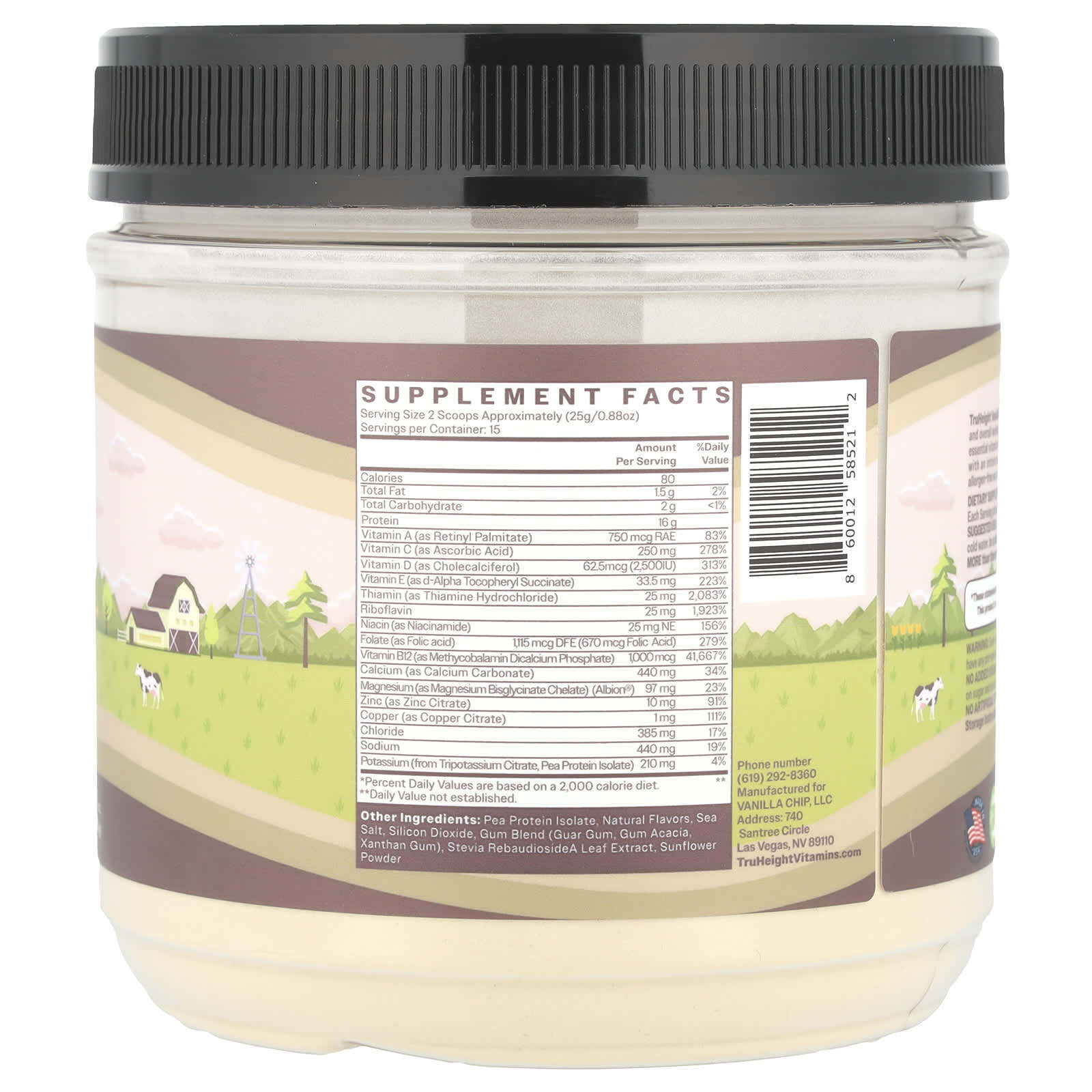 Порошок из ванильного и горохового протеина TruHeight поддерживает рост, силу и общее самочувствие благодаря сбалансированному питанию на растительной основе. Обогащенный необходимыми витаминами и минералами, он идеально подходит для растительной диеты или людей с непереносимостью лактозы или молочных продуктов. Наслаждайтесь вкусным, питательным и безаллергенным способом улучшить свой рост и здоровье.