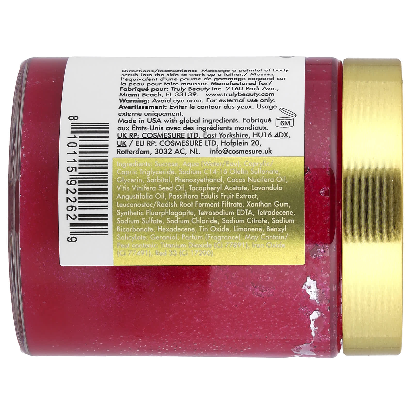 сахароза, вода, каприловый, каприновый триглицерид, натрия c1 4-16 олефин сульфонат, глицерин, сорбитол, феноксиэтанол, масло кокоса (Cocos nucifera), масло из семян винограда (Vitis vinifera), токоферилацетат, масло лаванды (Lavandula angustifolia), экстракт плодов маракуйи (Passiflora edulis), лейконосток/ферментированный фильтрат корня редиса, ксантановая камедь, синтетический фторфлогопит, тетранатрия ЭДТК, тетрадецен, сульфат натрия, хлорид натрия, цитрат натрия, бикарбонат натрия, гексадецен, оксид олова, лимонен, бензилсалицилат, гераниола, парфюмерная композиция (отдушка).