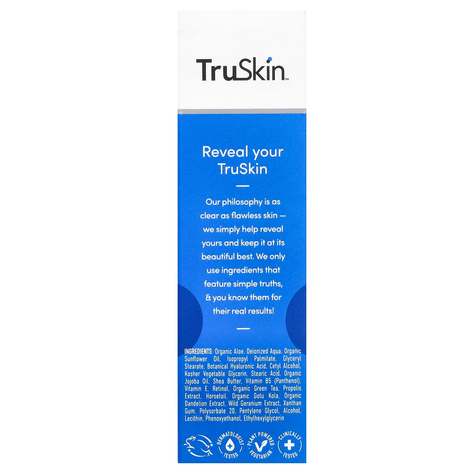 Органический алоэ, деионизированная вода, органическое подсолнечное масло, изопропилпальмитат, глицерил стеарат, ботаническая гиалуроновая кислота, цетиловый спирт, кошерный растительный глицерин, стеариновая кислота, органическое масло жожоба, масло ши, провитамин B5 (пантенол), витамин E, ретинол, органический зеленый чай, экстракт прополиса, хвощ, органическая готу кола, органический экстракт одуванчика, экстракт дикой герани, ксантановая камедь, полисорбат 20, пентилен гликоль, спирт, лецитин, феноксиэтанол, этилгексилглицерин.