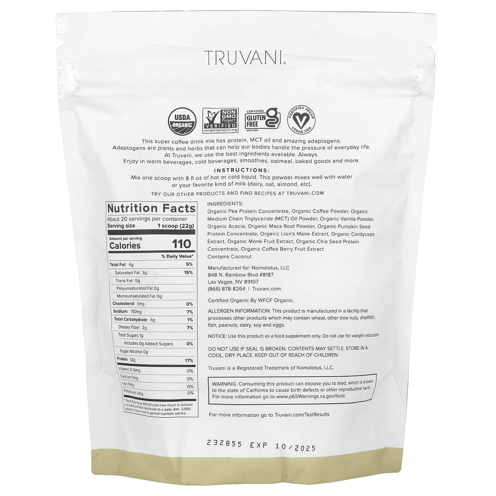 Этот суперкомфортный кофейный напиток содержит протеин, масло MCT и удивительные адаптогены. Адаптогены - это растения и травы, которые помогают нашему организму справляться с повседневными заботами. В Truvani мы используем только лучшие ингредиенты. Всегда. Наслаждайтесь теплыми и холодными напитками, смузи, овсянкой, выпечкой и многим другим.