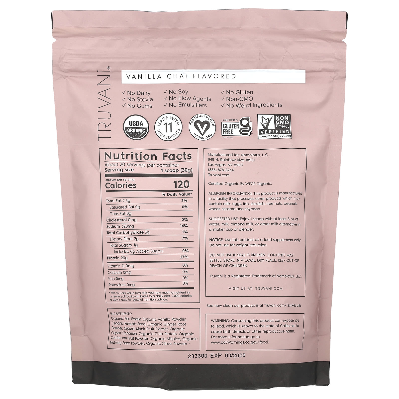 Органический гороховый белок, органический ванильный порошок, органические семена тыквы, порошок из органического корня имбиря, органический экстракт архата, органическая цейлонская корица, органический белок чиа, порошок из плодов органического кардамона, органический душистый перец, порошок из органических семян мускатного ореха, порошок из органической гвоздики