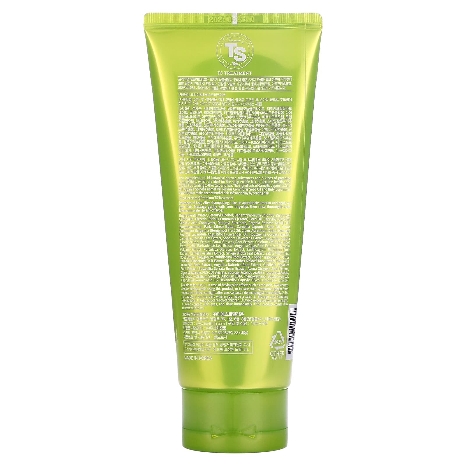 Вода, цетеариловый спирт, бегентримония хлорид, дикаприлил карбонат, глицерин, касторовое масло (Ricinus communis), сополимер каприлоил глицерина и себациновой кислоты, дигептил сукцинат, аргановое масло (Argania spinosa), масло ши (Butyrospermum parkii), масло из семян камелии японской (Camellia japonica), масло бергамота (Citrus aurantium bergamia), масло из цедры апельсина (Citrus aurantium dulcis), лавандовое масло (Lavandula angustifolia), экстракт хауттюйнии сердцевидной (Houttuynia cordata), экстракт листьев зеленого чая (Camellia sinensis), экстракт софоры желтоватой (Sophora flavescens), экстракт корня солодки (Glycyrrhiza glabra), экстракт корня женьшеня (Panax ginseng), экстракт корня жгун-корня (Cnidium officinale), экстракт листьев алоэ вера (Aloe barbadensis), экстракт корня дудника гигантского (Angelica gigas), экстракт полыни (Artemisia vulgaris), экстракт портулака огородного (Portulaca oleracea), экстракт сычуаньского перца (Zanthoxylum piperitum), экстракт готу колы (Centella asiatica), экстракт листьев гинкго билоба (Ginkgo biloba), экстракт корня шалфея краснокорневищного (Salvia miltiorrhiza), экстракт корня горца многоцветкового (Polygonum multiflorum), трипептид меди 1, экстракт плодов грейпфрута (Citrus paradisi), экстракт плодов трихозанта японского (Trichosanthes kirilowii), экстракт зерен адзуки (Phaseolus angularis), экстракт корня дудника даурского (Angelica dahurica), экстракт плодов гледичии японской (Gleditsia japonica), экстракт камеди босвеллии пильчатой (Boswellia serrata), экстракт семян овса щетинистого (Avena strigosa), глицерил стеарат, ПЭГ-100 стеарат, изопропиловый спирт, лецитин, токоферилацетат, лимонная кислота, сорбат калия, двунатриевая ЭДТК, феноксиэтанол, бутиленгликоль, каприлгидроксаминовая кислота, 1,2-гександиол, каприлилгликоль, лимонен, линалоол.