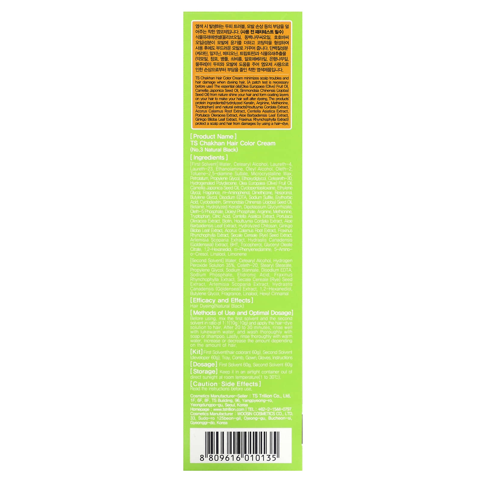Крем-краска для волос TS Chakan сводит к минимуму проблемы с кожей головы и повреждение волос при окрашивании. (Перед использованием необходимо провести кожную аллергическую пробу.) Эфирные масла (масло плодов оливы европейского (Olea europaea), масло семян камелии японской (Camellia japonica), масло семян жожоба (Simmondsia chinensis)) от природы мягкая после окрашивания. Протеиновые ингредиенты продукта (гидролизованный кератин, аргинин, метионин, триптофан) и натуральные экстракты (экстракт хауттюйнии, экстракт корня аира (Acorus calamus), экстракт готу колы (Centella asiatica), экстракт портулака огородного (Portulaca oleracea), экстракт листьев алоэ вера (Aloe barbadensis), экстракт листьев гинкго билоба (Fraxinus rinchophylla)) защищают кожу головы и волосы от повреждений, вызванных краской для волос.