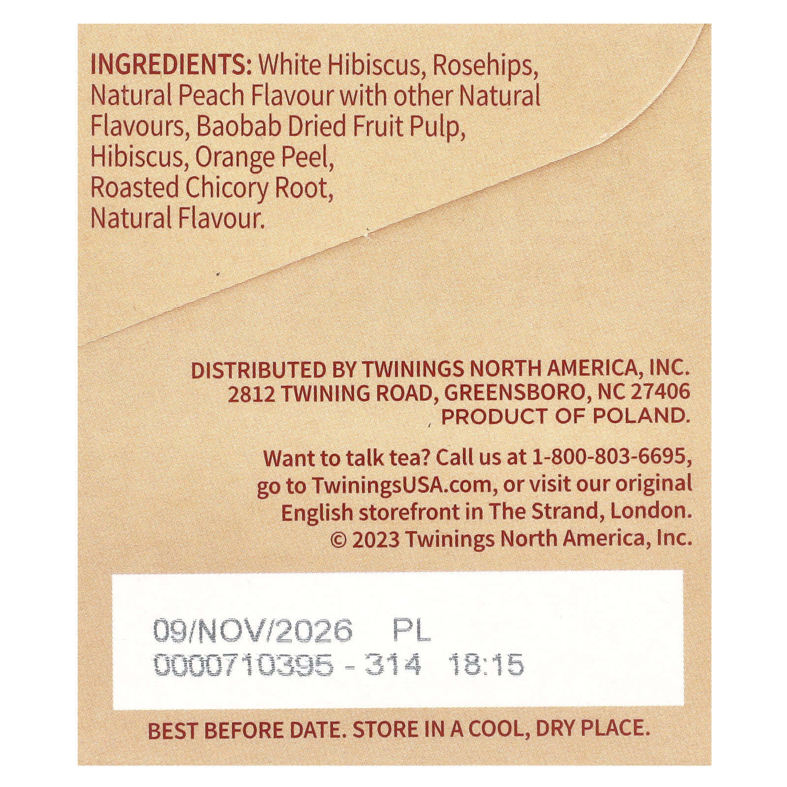 Белый гибискус, плоды шиповника, натуральный персиковый ароматизатор с другими натуральными ароматизаторами, мякоть сухофруктов баобаба, гибискус, апельсиновая цедра, обжаренный корень цикория, натуральный ароматизатор.