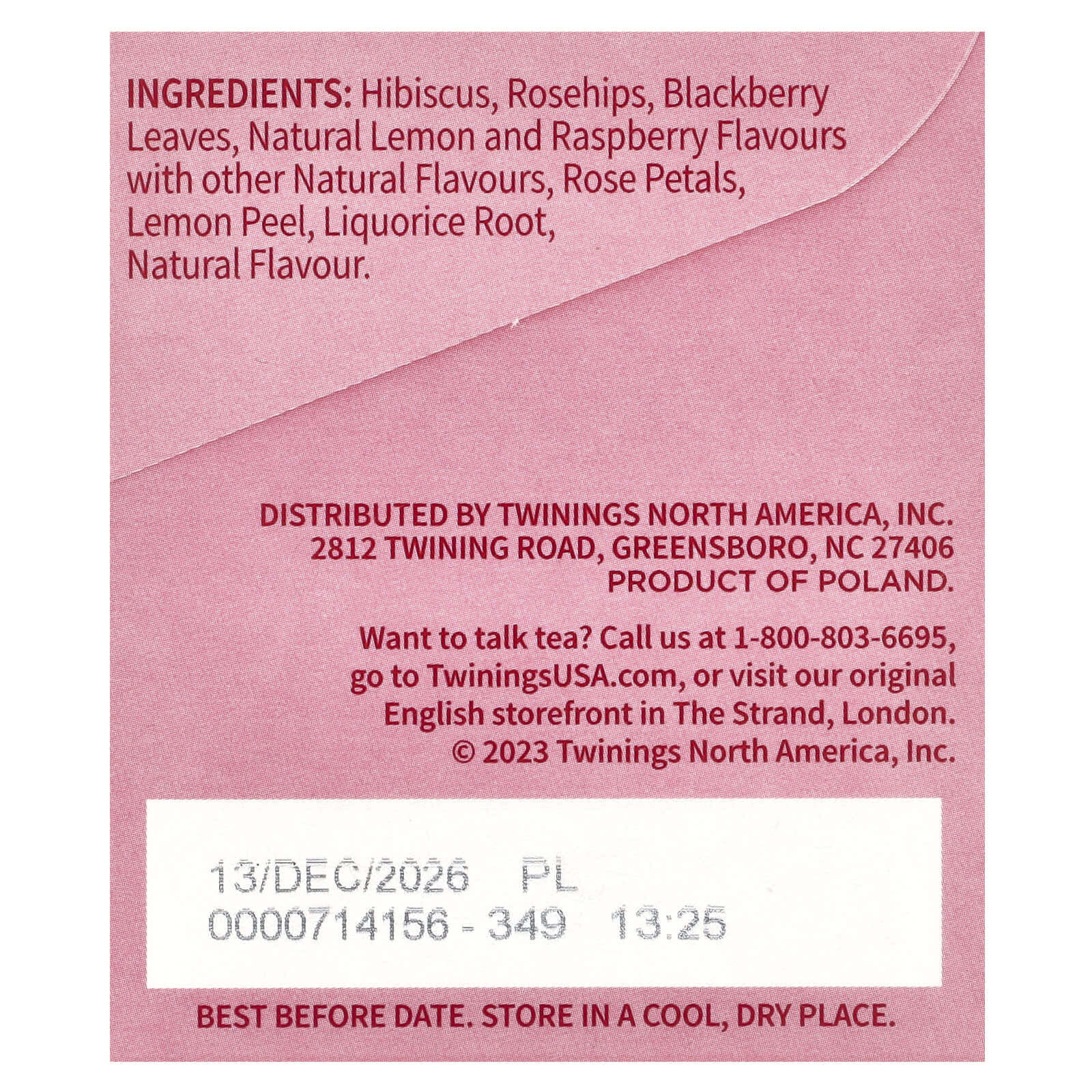 Гибискус, плоды шиповника, листья ежевики, натуральные вкусы лимона и малины с другими натуральными ароматизаторами, лепестки роз, цедра лимона, корень солодки, натуральный ароматизатор.