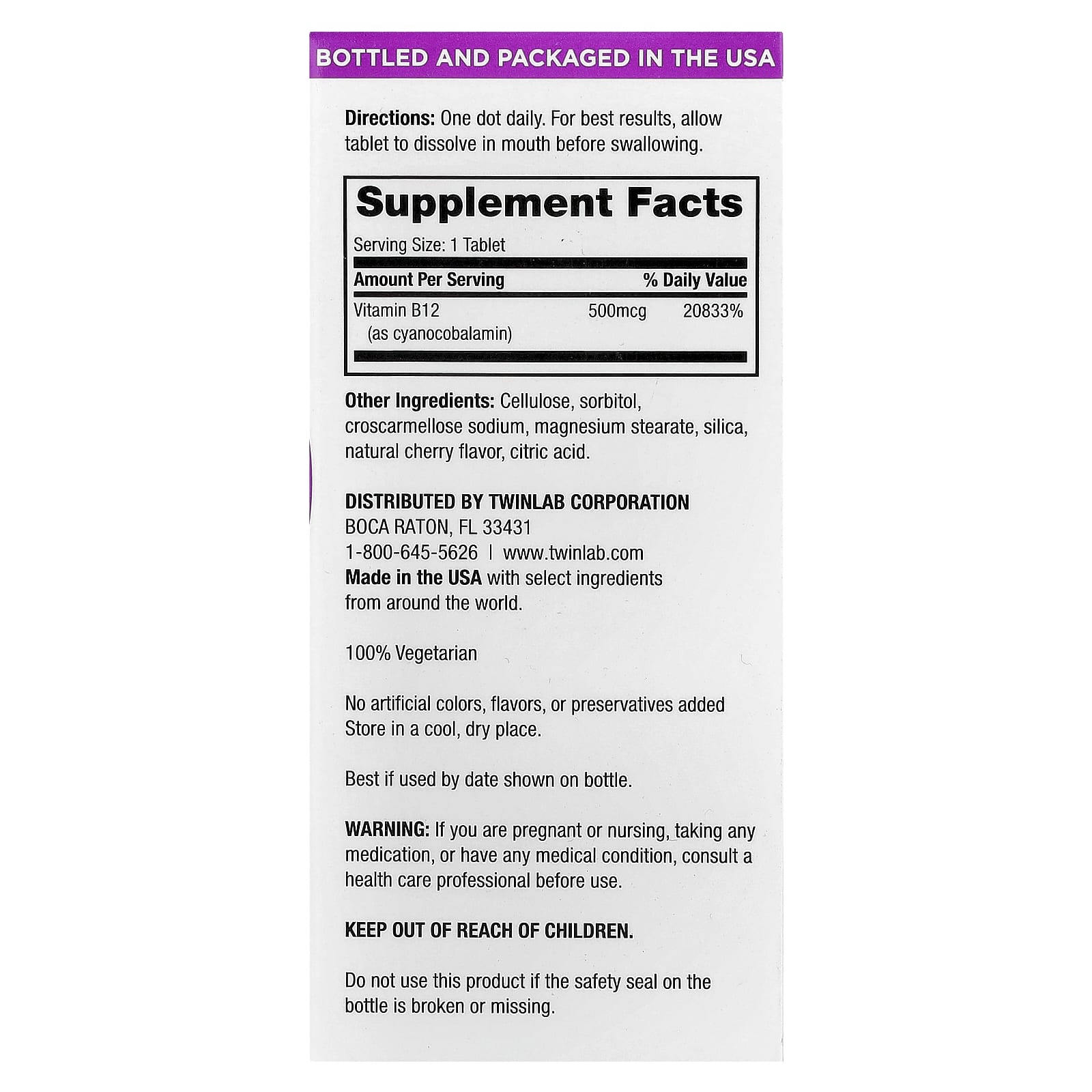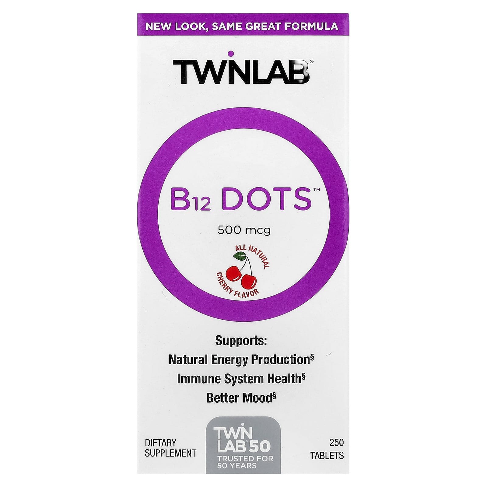 Twinlab® B12 Dots ™ - это специально разработанные микротаблетки, которые быстро растворяются во рту и содержат 500 мкг витамина B12 в каждой таблетке с восхитительным вкусом вишни.