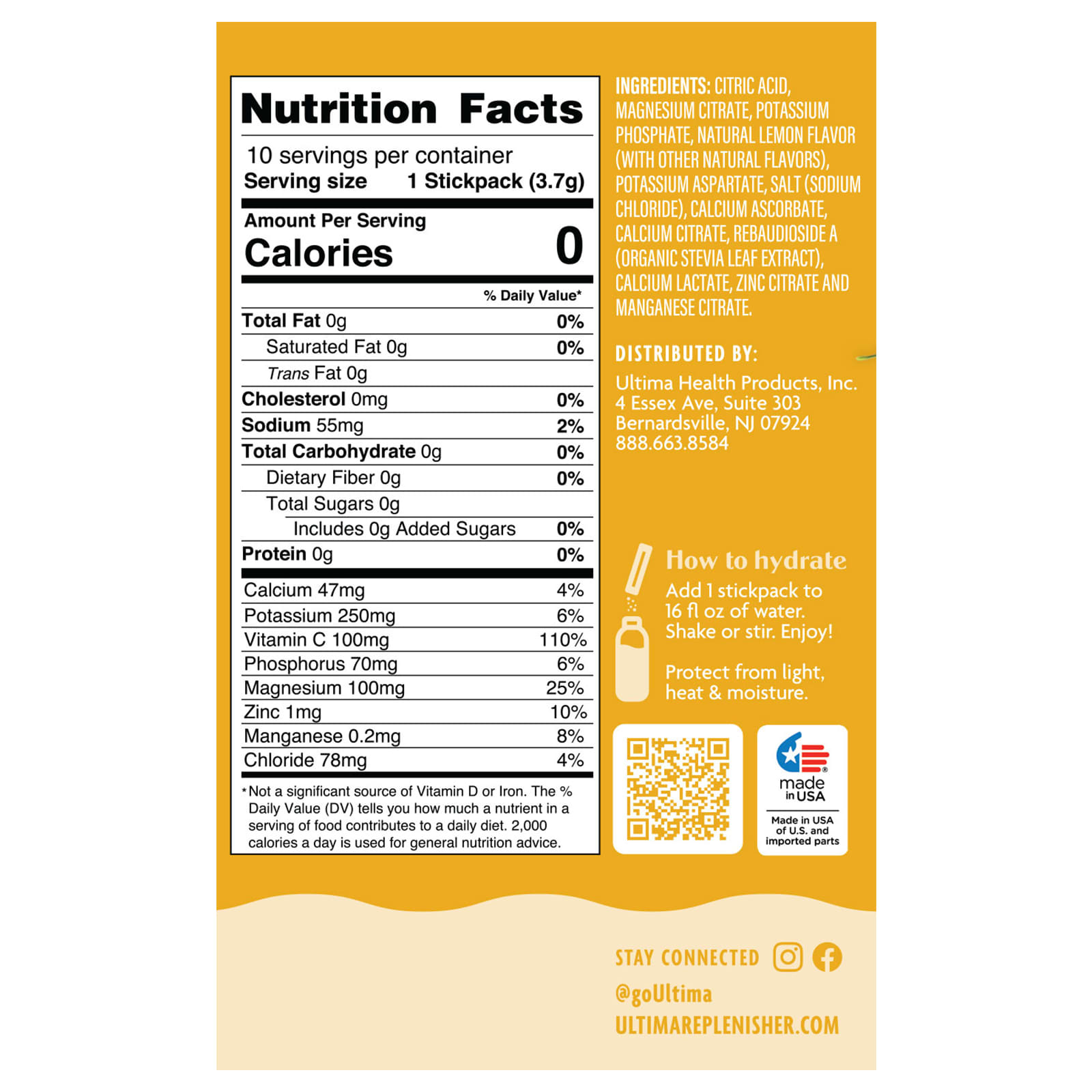Лимонная кислота, цитрат магния, фосфат калия, натуральный лимонный ароматизатор (с другими натуральными ароматизаторами), аспартат калия, соль (хлорид натрия), аскорбат кальция, цитрат кальция, ребаудиозид А (органический экстракт листьев стевии), лактат кальция, цитрат цинка и цитрат марганца.