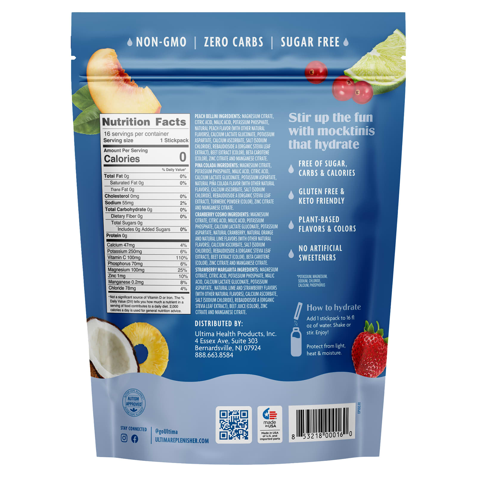 Ингредиенты для пина колада: Цитрат магния, фосфат калия, лимонная кислота, яблочная кислота, аспартат калия, натуральный ароматизатор «Пина колада» (с другими натуральными ароматизаторами), цитрат кальция, аскорбат кальция, соль (хлорид натрия), органический ребаудиозид А (из листьев органической стевии), порошок из куркумы (краситель), цитрат цинка и цитрат марганца.