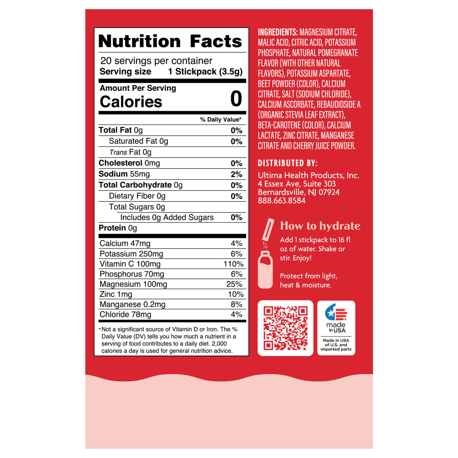 Цитрат магния, яблочная кислота, лимонная кислота, фосфат калия, аспартат калия, цитрат кальция, натуральный ароматизатор «Гранат» (с другими натуральными ароматизаторами), аскорбат кальция, соль (хлорид натрия), ребаудиозид А (из листьев органической стевии), порошок из свеклы (краситель), бета-каротин (краситель), цитрат цинка, порошок из темной вишни, цитрат марганца.