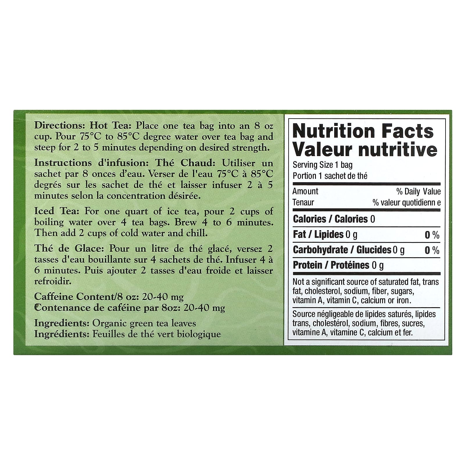 Содержание кофеина/240 мл (8 унций): 20–40 мг