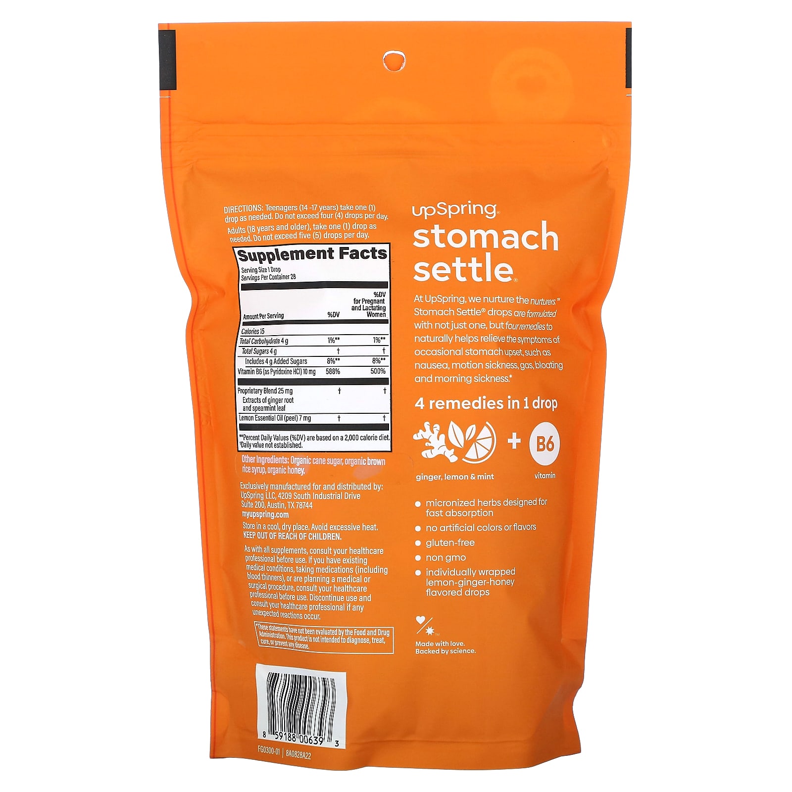 UpSpring, желудок успокоен. В UpSpring мы заботимся о детях. ™ В состав капель StomachSettle® входят не одно, а четыре средства, которые естественным образом помогают облегчить симптомы периодического расстройства желудка, такие как тошнота, укачивание, газообразование, вздутие живота и утренняя тошнота .