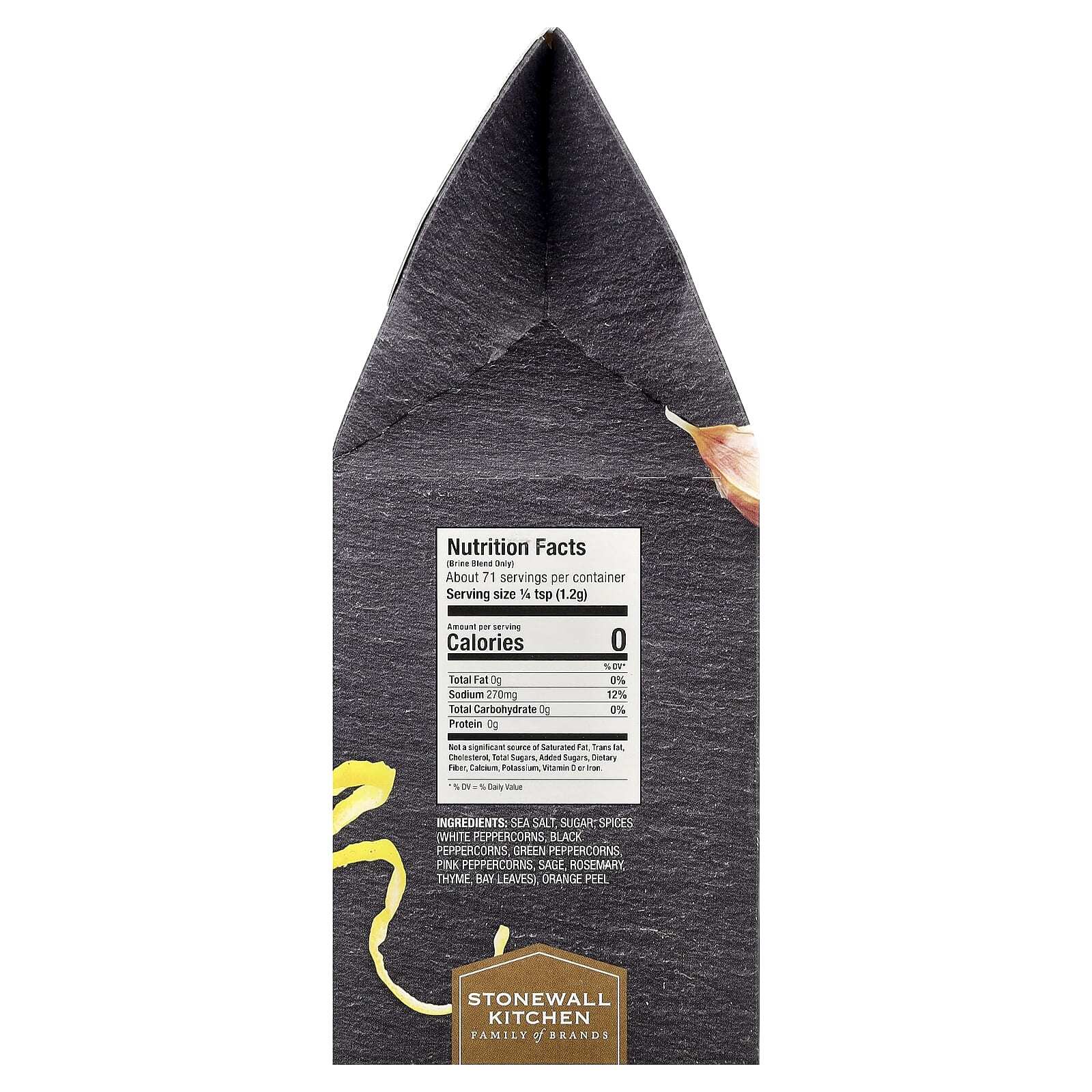 Смесь рассола: Морская соль, сахар, специи (белый перец горошком, черный. перец горошком, зеленый перец горошком, розовый перец горошком, шалфей, розмарин, чабрец, лавровый лист), апельсиновая цедра.