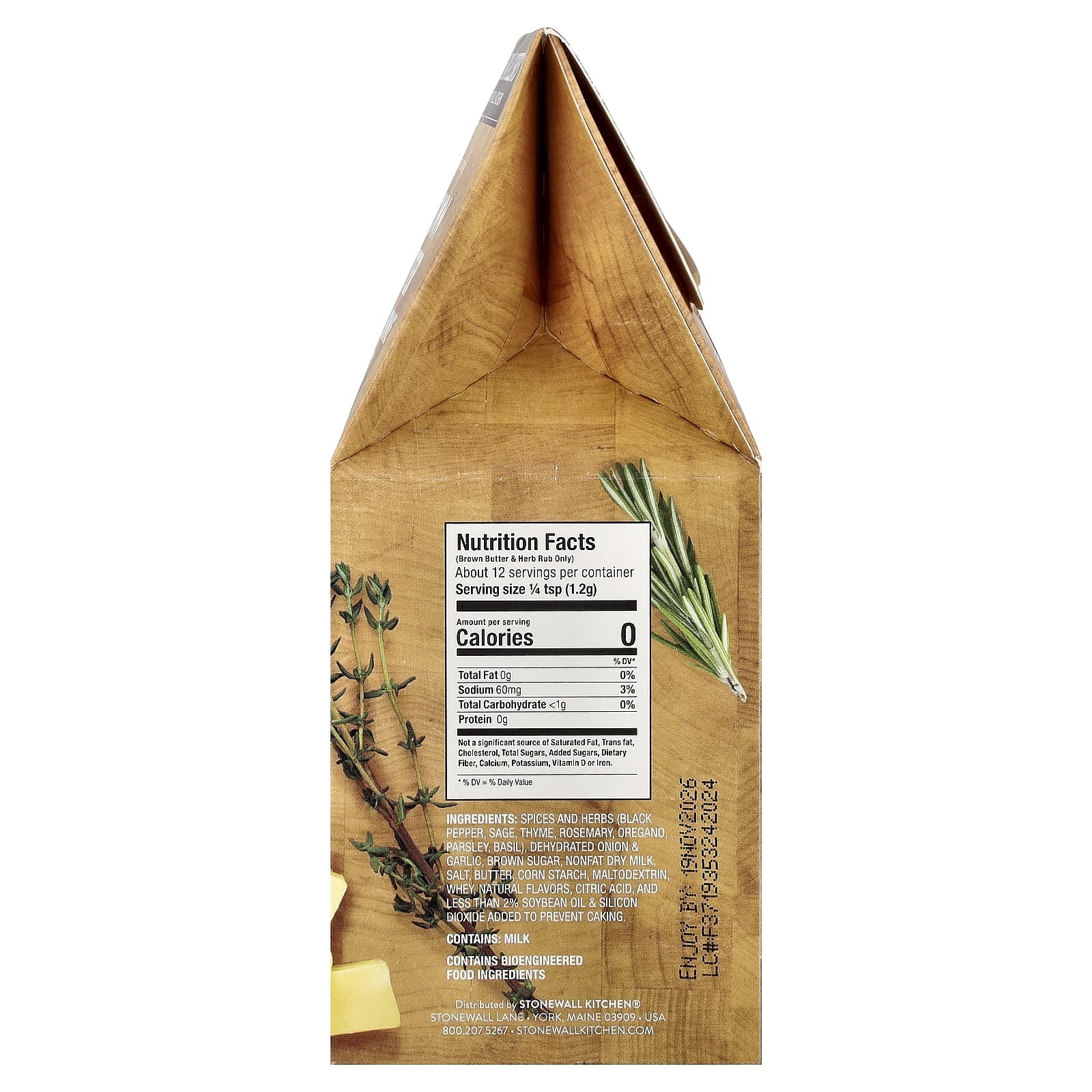 Коричневое масло и масло Растирание с травами: Пряности и зелень (черный перец, шалфей, чабрец, розмарин, орегано, петрушка, базилик), обезвоженный лук и чеснок, коричневый сахар, обезжиренное сухое молоко, соль, сливочное масло, кукурузный крахмал, мальтодекстрин, сыворотка, натуральные ароматизаторы, лимонная кислота, и менее 2% соевого масла & amp; добавлен диоксид кремния для предотвращения слеживания.