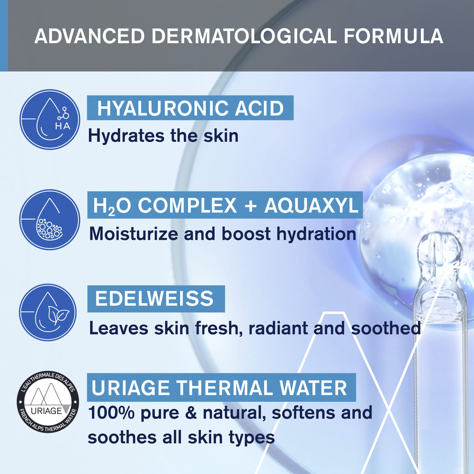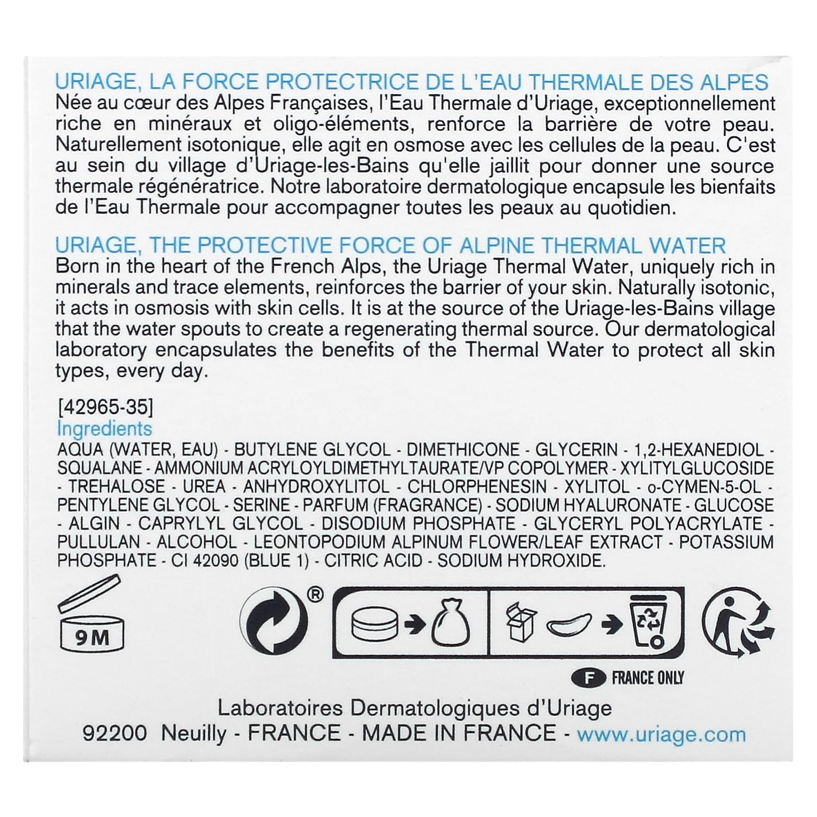 Термальная вода Uriage, родившаяся в самом сердце французских Альп, уникально богата минералами и микроэлементами, укрепляет защитный барьер вашей кожи. Естественно изотонический, он действует на клетки кожи путем осмоса. Именно у истоков поселка Урьяж-ле-Бен извергается вода, образуя регенерирующий термальный источник. В нашей дерматологической лаборатории используются преимущества термальной воды для ежедневной защиты всех типов кожи.